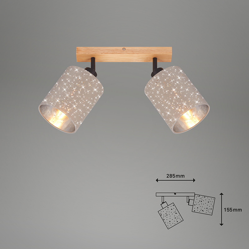 Осветително тяло - спот STOFA, изработен от дървена основа и текстилни абажури с ефект звездно небе в сиво. Дизайнът на осветителното тяло е подходящ за осветление за всекидневна, осветление за коридор, осветление за спалня. Производител BRILO, Германия.