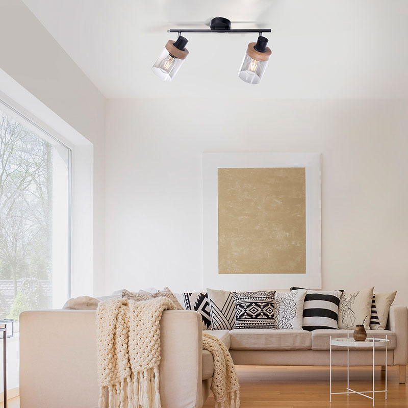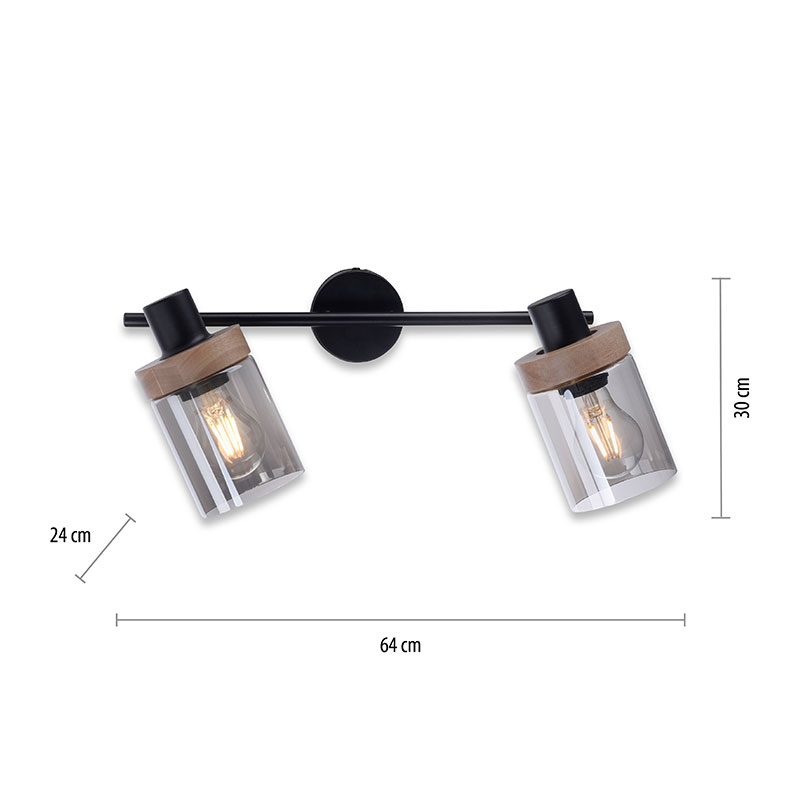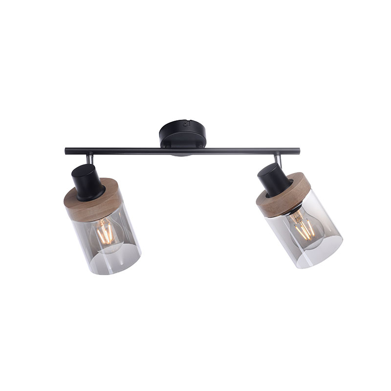 Спот PASQUAL, изработен от метал в черен цвят с елегантен акцент от каучуково дърво и разсейватели от опушено стъкло. Таванната лампа е с линейна форма и два подвижни светлоизточника, които позволяват да насочите светлината, където е необходима.