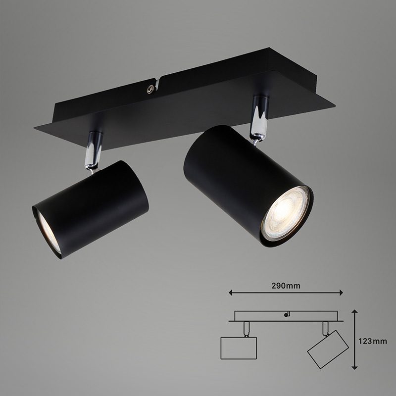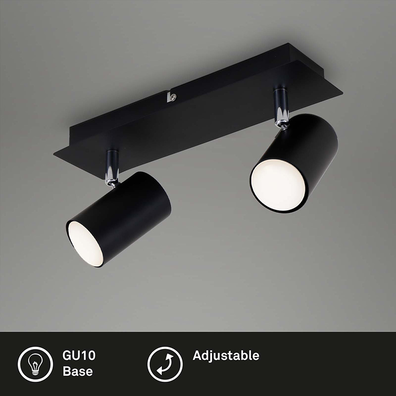 Насочваща се лампа за стена или таван RUN. Спотът е изработен от метал в черно. Главите на лампата са подвижни за прецизно насочване на светлината. Дизайнът на осветителното тяло е подходящ за допълнително осветление за всекидневна, осветление за спалня, осветление за хотел. Производител BRILO, Германия.