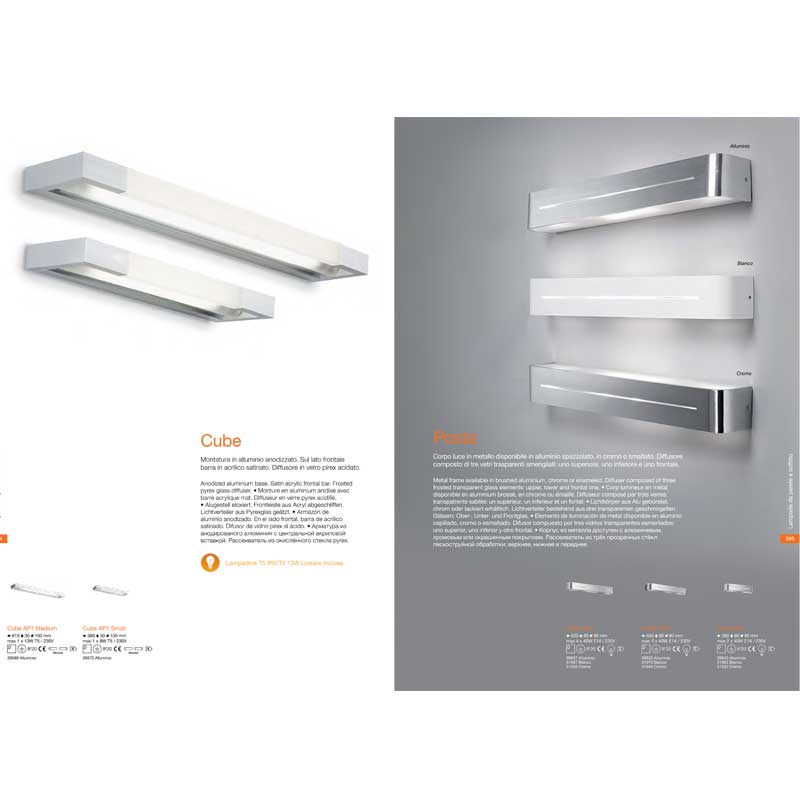 Стенен аплик Posta с метална рамка в три цветови варианта: надран алуминий, хром или бяло и дифузер, съставен от три части от матирано стъкло - предна, горна и долна. Производител Ideal Lux, Италия.
