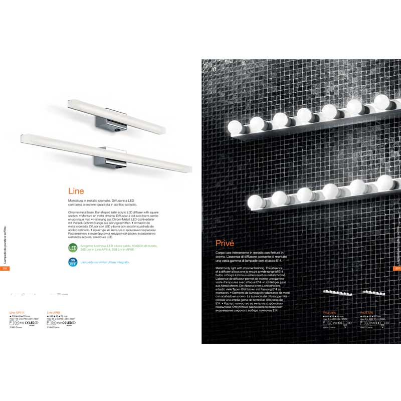 Стенен аплик Prive с метално тяло с хромирано покритие. Липсата на дифузер позволява поставянето на разнообразни модели електрически крушки. Производител Идеал Лукс, Италия.