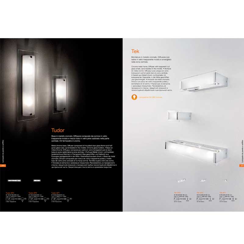 Аплик Tudor с хромирана метална рамка и дифузер от правоъгълна, прозрачна основа и разположена върху нея тръбовидна част от прозрачно, огнеупорно стъкло с матирана централна част, захванати с хромирани метални държачи. Производител Идеал Лукс, Италия.