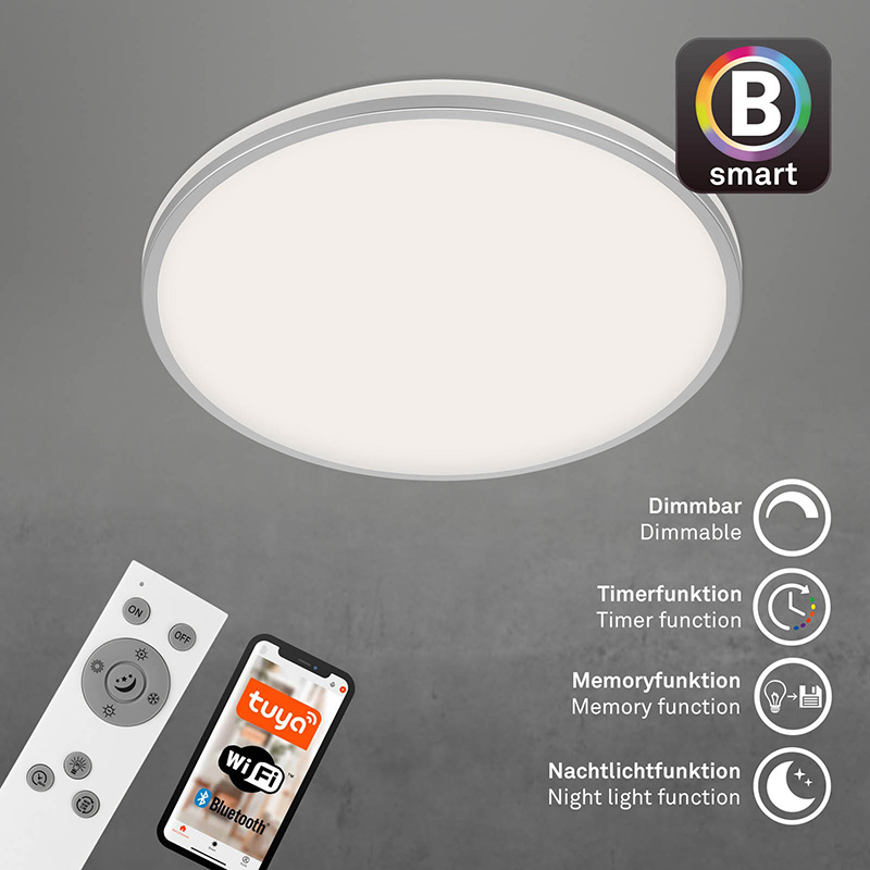 Осветително тяло - умен лед плафон IVY SKY, изработен от метална основа и пластмасов разсейвател с ефект звездно небе. Плафонът е част от серията за умен дом B SMART. Можете да контролирате осветителното тяло гласово чрез Amazon Alexa или Google Home; чрез приложението; чрез дистанционно или по класическия начин, чрез ключа на стената. Лесно и удобно включвайте и изключвайте осветлението; променяйте цвета на светлината от топла (3000K) към студена (6500К); регулирайте силата на светене от слабa към силнa светлина и обратното; настройте таймер за изключване; изпозлвайте функцията за нощен режим. Плафонът е с функция памет, чрез която помни вашите настройки. Дизайнът на осветителното тяло е подходящ за осветление за всекидневна, осветление за коридор, осветление за спалня. Производител BRILO, Германия.