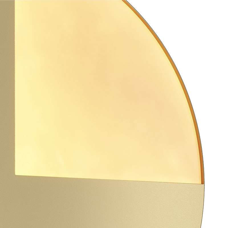 LED аплик Jupiter е изработен от алуминий в стилен месингов цвят с елегантна кръгла форма. Лампата за стена се отличава с минималистичен дизайн и един изрязан триъгълник, през който излъчва светлина, създавайки ефект, напомнящ часовник. Осветителното тяло комбинира модерна LED технология с изчистена естетика, което го прави подходящо за съвременни интериори.