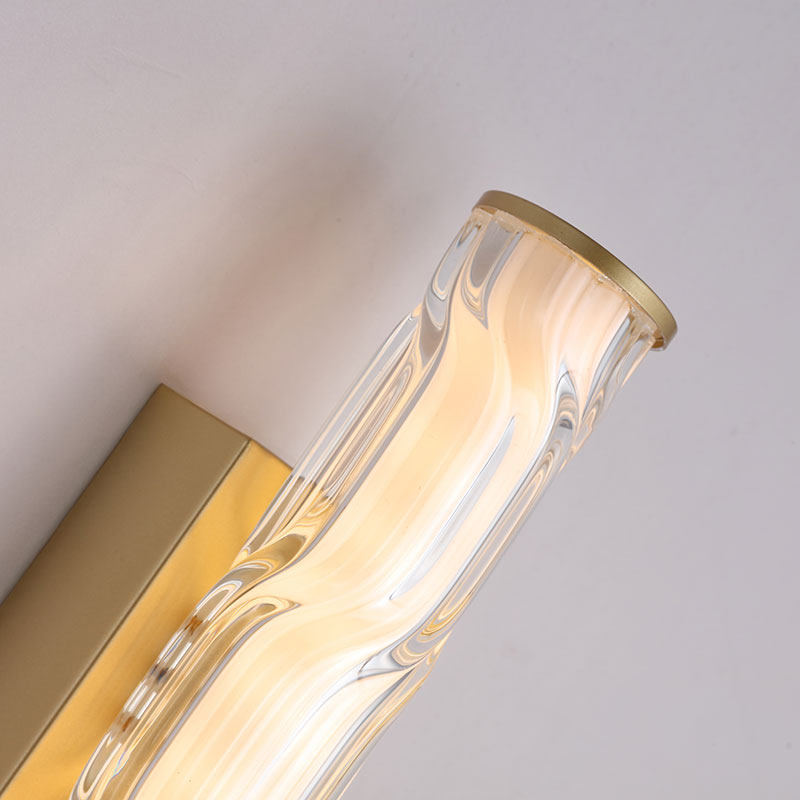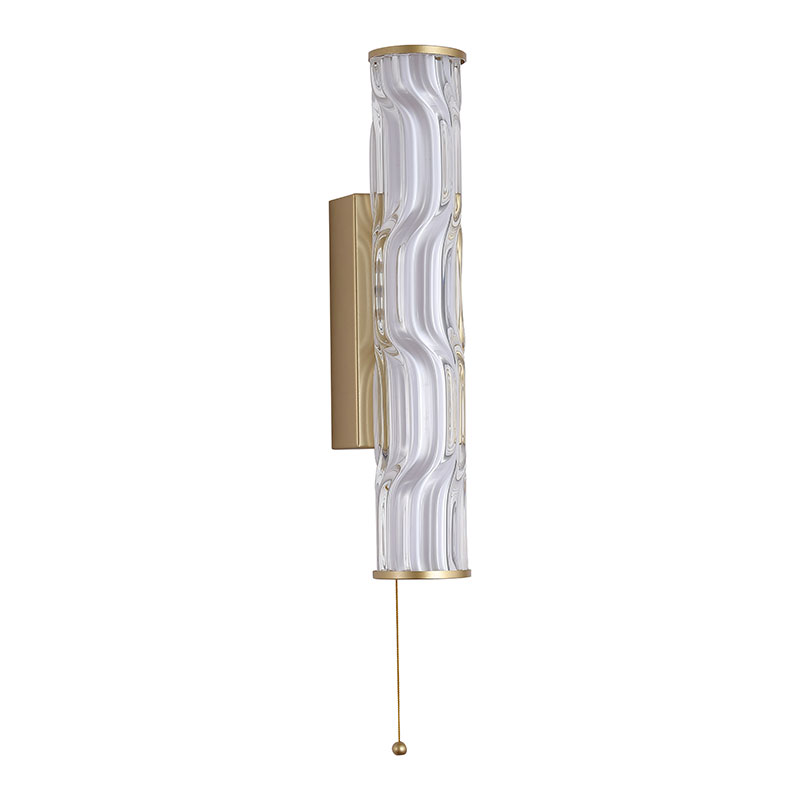 LED аплик Vibrate впечатлява с елегантен и модерен дизайн, който съчетава изчистени линии и артистичен характер. Конструкцията от матово златист метал е допълнена от стъклен дифузер с вълнообразна форма, който разсейва светлината меко и равномерно, създавайки уютна и стилна атмосфера. Вграденият LED модул с топла светлина (3000K) осигурява комфортно осветление, а възможността за димиране чрез Triac димер позволява лесно регулиране на интензитета според настроението. Апликът разполага и с практичен превключвател с декоративна златиста топка, което го прави подходящ избор за спални, дневни зони или кът за четене, където се търси функционален и естетически акцент.