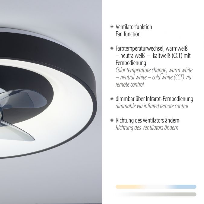 Таванният вентилатор е с функция димиране чрез дистанционно управление за регулиране на силата на светлината според нуждите; CCT контрол, който позволява промяна на цветната температура от топла (2700K) до студено бяла светлина (5000K) за адаптиране към различните моменти от деня; вграден LED модул за енергоспестяващо осветление; тих двигател, който осигурява ефективно охлаждане без шум.
