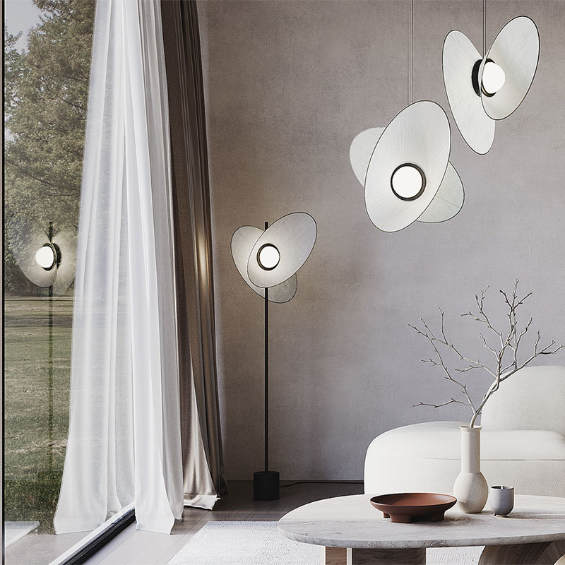 LED лампион Evolution е изработен от алуминий в черен цвят и текстилен абажур в бяло. Овалните форми на абажура придават изразен характер на дизайна, а меката светлина, която преминава през плата, създава комфортна и отпускаща атмосфера в помещението.