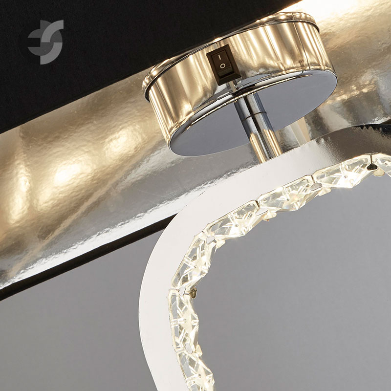 Осветително тяло - LED лампион, с метална основа в цвят хром с декоративни кристални елементи и вградено ЛЕД осветление (в основата), текстилен абажур в черен цвят от външната страна и сребрист от вътрешна. Подходящ за осветление за спалня, осветление за всекидневна или хотел. Производител Searchlight, Англия.