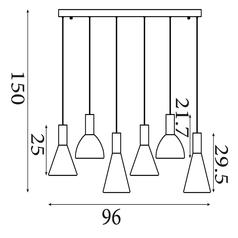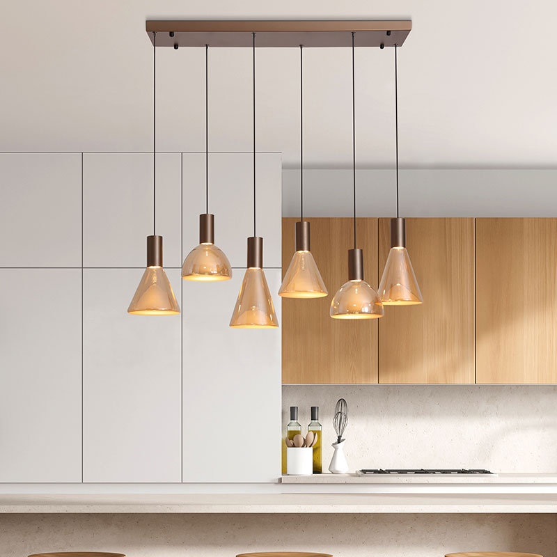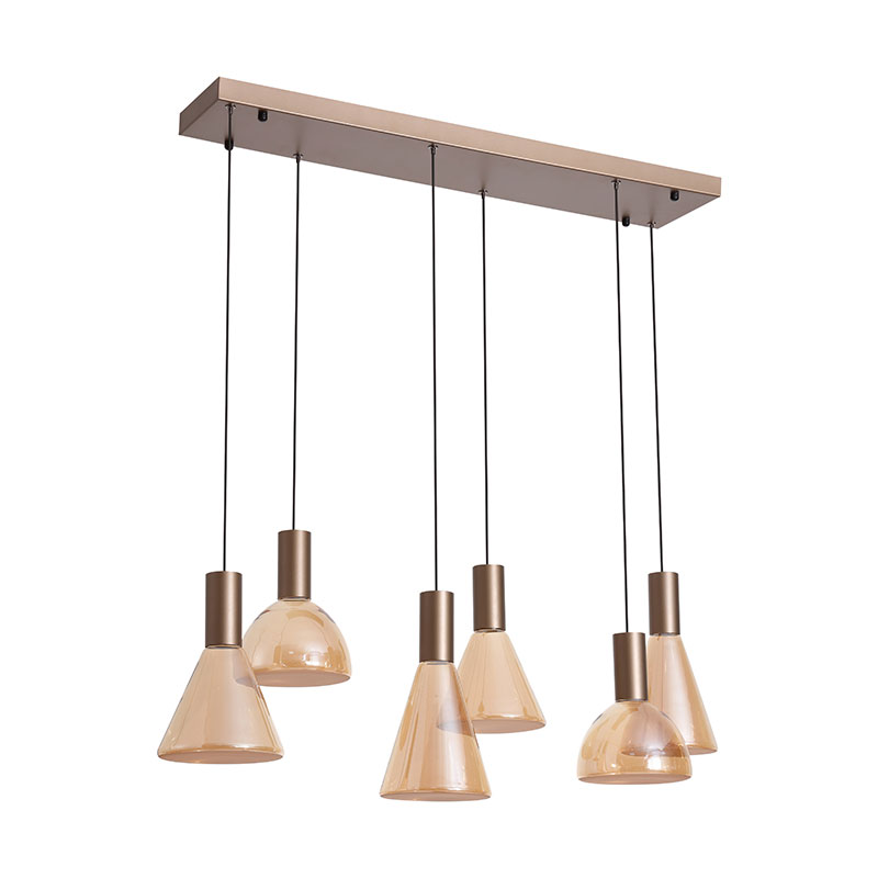 LED полилей Cannes е изработен от метал в топъл цвят лате, комбиниран с разсейватели от стъкло в кехлибарен нюанс. Висящата лампа е с шест светлоизточника и е разположена върху линейна таванска основа, което създава балансирана и елегантна визия с мек декоративен акцент.