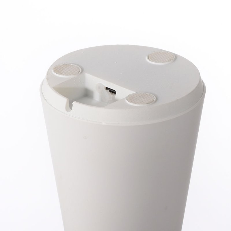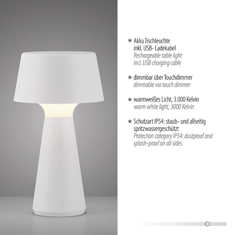 LED настолна лампа на батерия IP54 ABERA, изработена от пластмаса в бял цвят с модерен конусовиден дизайн и минималистична форма.