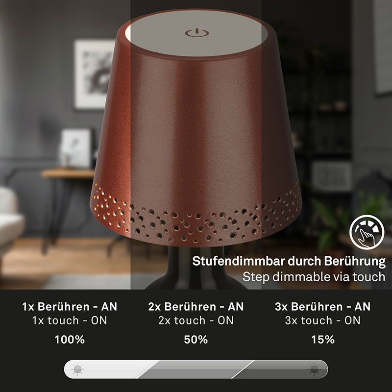Настолна лампа FLASKA разполага с 3-степенен тъч димер, който ви позволява да регулирате яркостта на светлината според вашите нужди. Лампата се зарежда чрез USB и разполага с вградена батерия с капацитет от 2600mAh. След пълното зареждане, можете да се насладите на осветление в продължение на 24 часа.