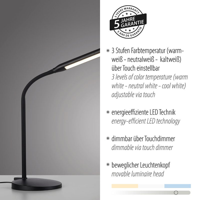 Лампата за бюро е с 3-степенен контрол на цветната температура чрез тъч (2700K-5000K), което ви позволява да регулирате светлината според нуждите - топла светлина за релакс, неутрална за ежедневни дейности или студена за концентрирана работа. Осветителното тяло е с безстепенно димиране чрез тъч димер и подвижна светлинна глава, която ви дава възможност да насочвате светлината точно там, където е необходима. Лампата е с 150 см кабел за удобно позициониране.