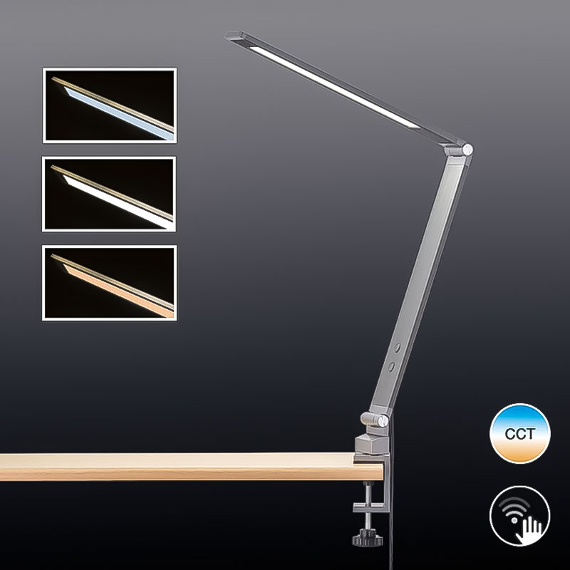 Осветителното тяло е с вграден CCT модул, който ви позволява регулиране на цветната температура на четири степени - топла (2700K), мека неутрална (3800K), студено-бяла (5000K) и студено-синя (6500K). Настолната лампа за бюро е с опция за димиране в четири степени (10%, 25%, 50%, 100% сила на светене).