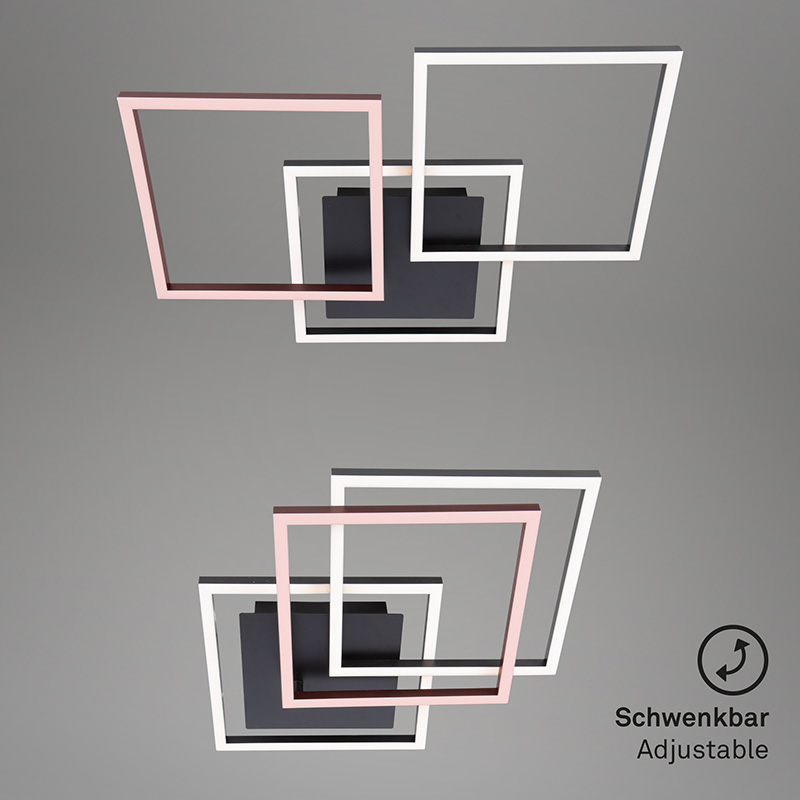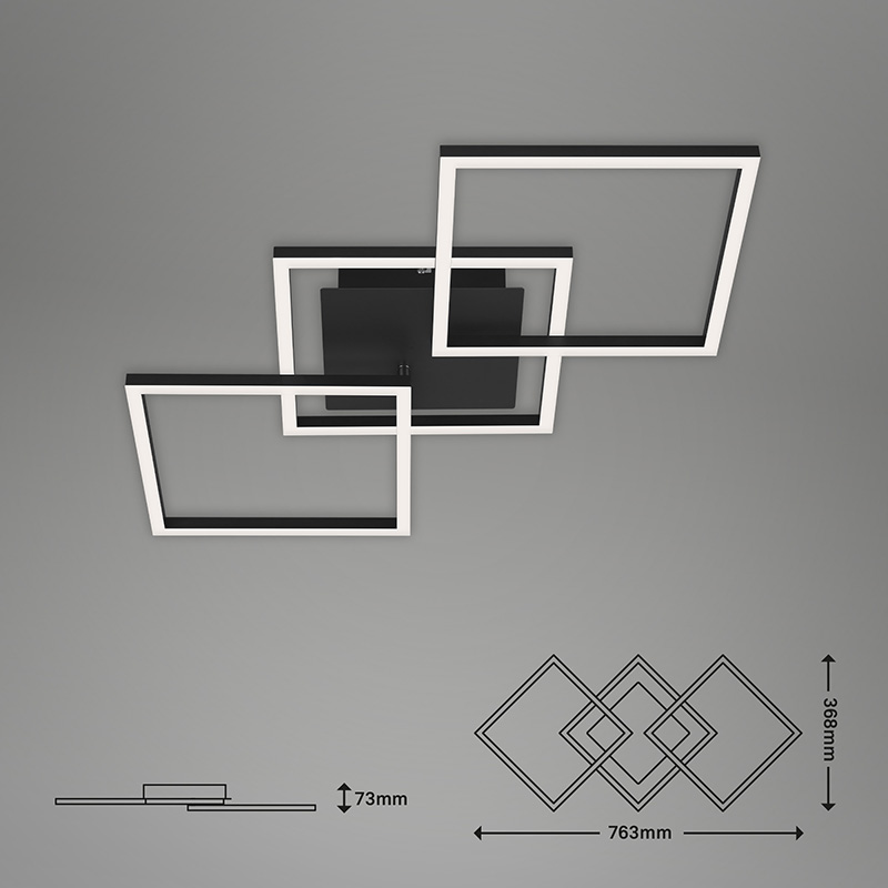 LED плафон FRAME, изработен от метална основа в черен цвят и подвижни разсейватели в бяло. Плафонът се димира на степени чрез ключа на стената. Плафонът е с функция памет, чрез която помни вашите последни настройки. Дизайнът на осветителното тяло е подходящ за осветление за всекидневна, осветление за коридор, осветление за спалня. Производител BRILO, Германия.
