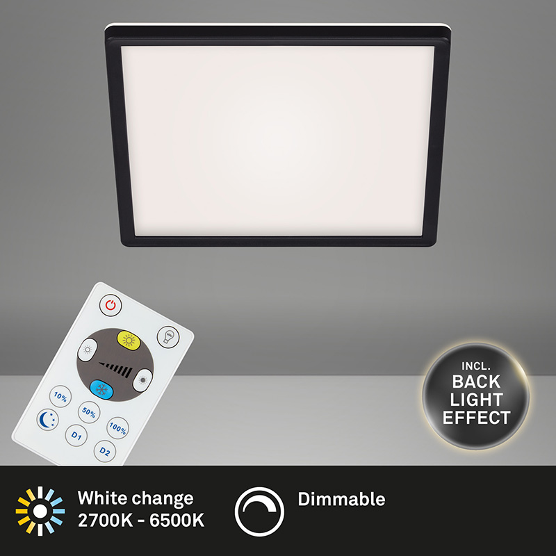 LED плафон SLIM CCT, изработен от метална основа и пластмасов разсейвател в черен цвят, с подсветка. Плафонът е с включено в комплекта дистанционно. Лесно и удобно включвайте и изключвайте осветлението; променяйте цвета на светлината от топла (2700K) към студена (6500К); регулирайте силата на светене от слабa към силнa светлина и обратното; настройте таймер за изключване; изпозлвайте функцията за нощен режим. Дизайнът на осветителното тяло е подходящ за осветление за всекидневна, осветление за коридор, осветление за спалня. Производител BRILO, Германия.