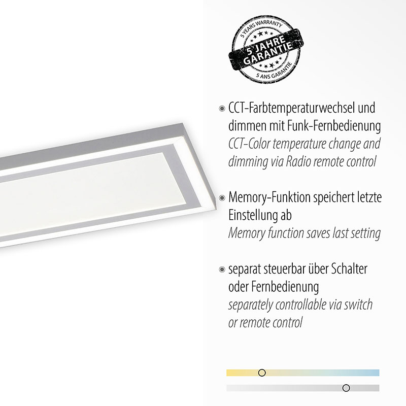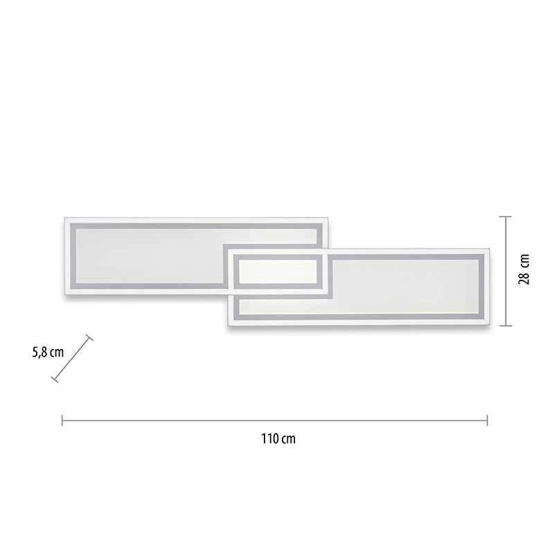 Осветителното тяло впечатлява с модерния си минималистичен дизайн и елегантна правоъгълна форма с размери 110x28 см. Благодарение на включеното дистанционно управление, имате пълен контрол над всички функции: