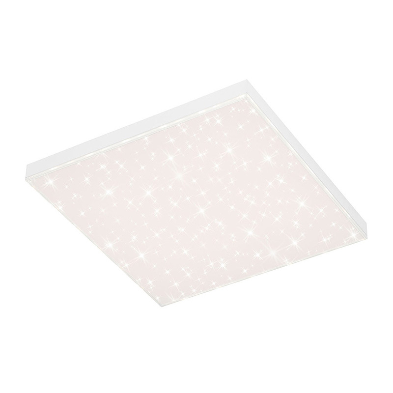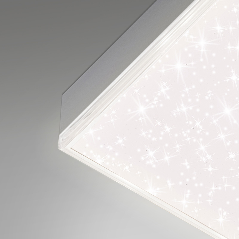 Осветително тяло - лед плафон FRAMELESS, изработен от метална основа и пластмасов разсейвател с ефект звездно небе. Плафонът е с включено в комплекта дистанционно, чрез което можете лесно и удобно да включвате и изключвате плафона; да димирате светлината от слаба към силна и обратното; да променяте цветната температура на светлината от топло бяла до студена. Дизайнът на осветителното тяло е подходящ за осветление за всекидневна, осветление за коридор, осветление за спалня. Производител BRILO, Германия.