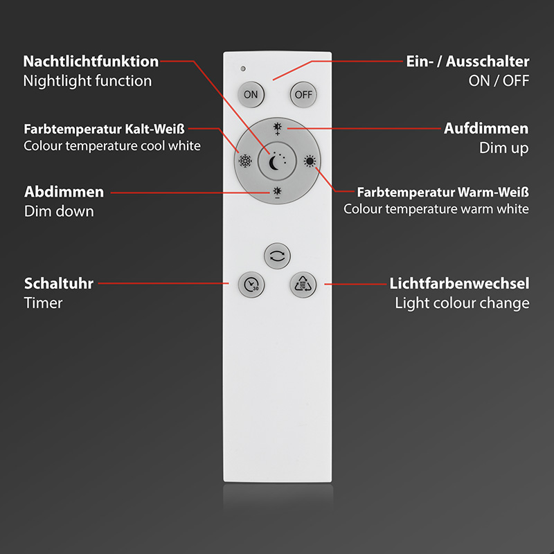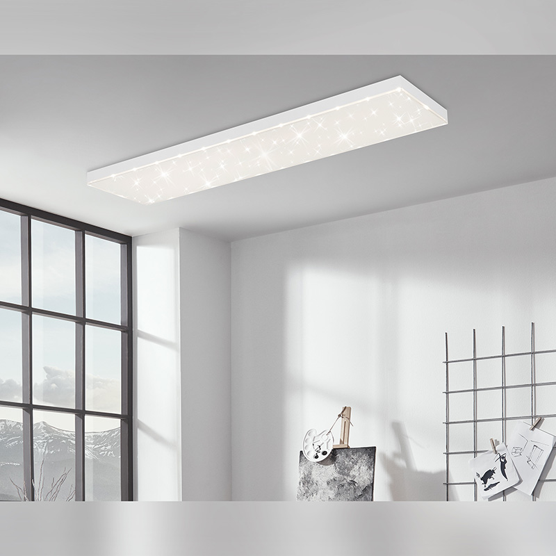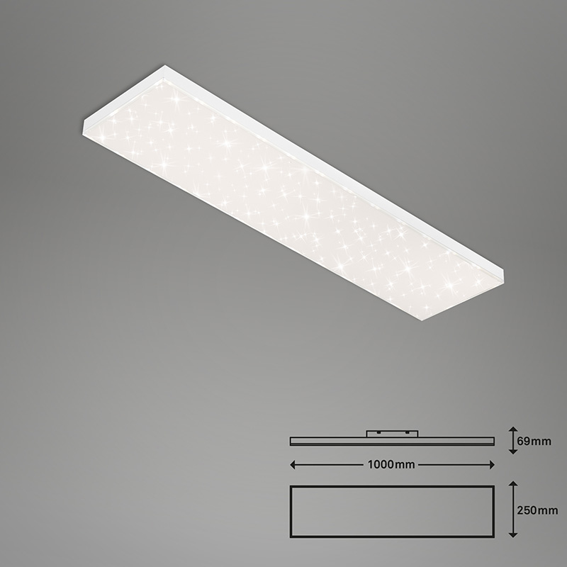 Осветително тяло - лед плафон FRAMELESS, изработен от метална основа и пластмасов разсейвател с ефект звездно небе. Плафонът е с включено в комплекта дистанционно, чрез което можете лесно и удобно да включвате и изключвате плафона; да димирате светлината от слаба към силна и обратното; да променяте цветната температура на светлината от топло бяла до студена. Дизайнът на осветителното тяло е подходящ за осветление за всекидневна, осветление за коридор, осветление за спалня. Производител BRILO, Германия.