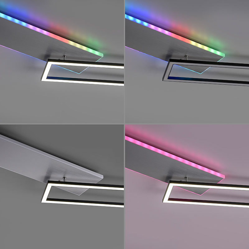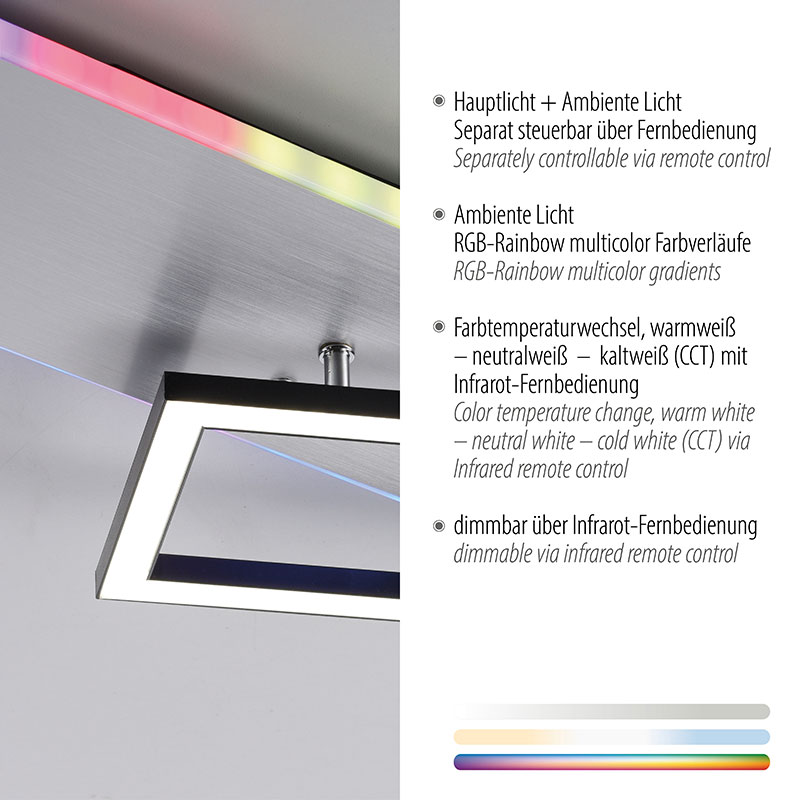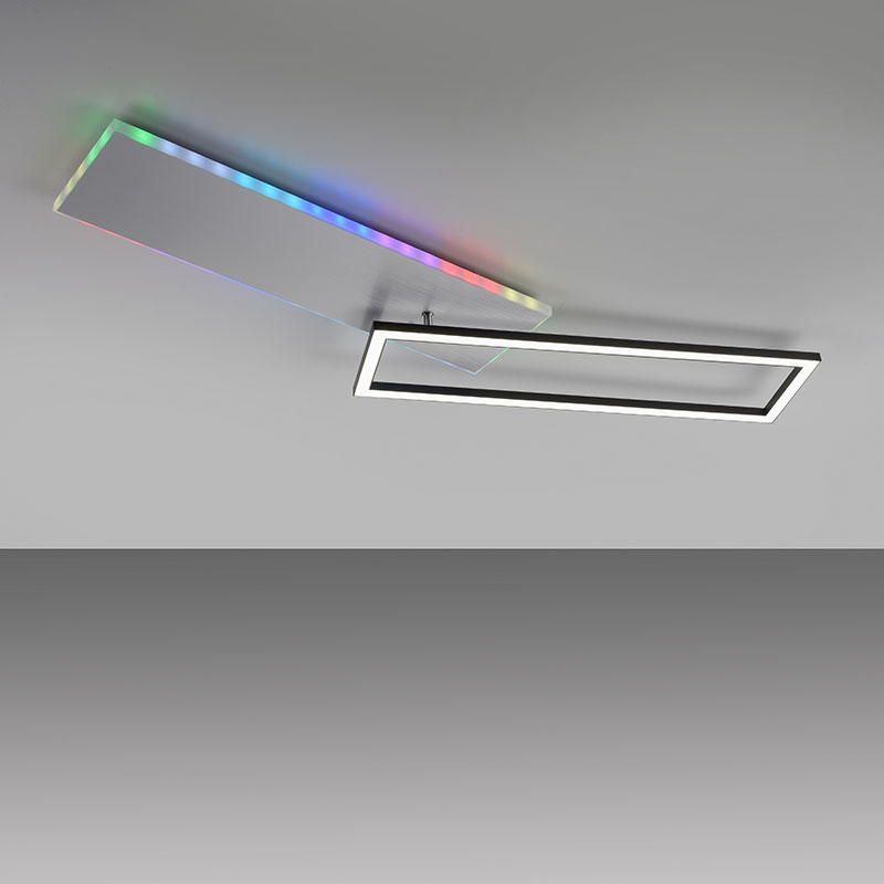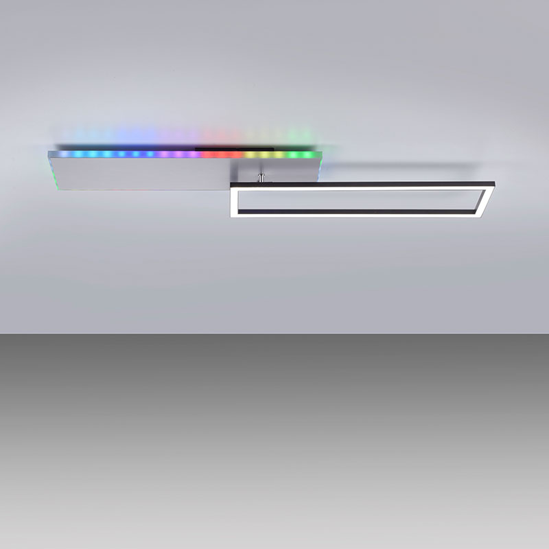 LED Плафон с дистанционно Renda, изработен от алуминий в черен цвят и разсейвател от бял акрил. Таванната лампа е с дистанционно управление, чрез което лесно и удобно можете да включвате и изключвате осветителното тяло; да димирате - увеличавате или намалявате светлината; да променяте цветната температура - от топла към студена светлина; да променяте цветовете - червен, зелен, син и техните производни; с функция Нощна лампа - 10% светлина. Плафонът също е с модул RGB RAINBOW, което означава, че можете да включите няколко цвята едновременно. Осветителното тяло е в модерен стил и е подходящ за осветление за всекидневна, коридор и спалня. Производител Leuchten Direkt, Германия