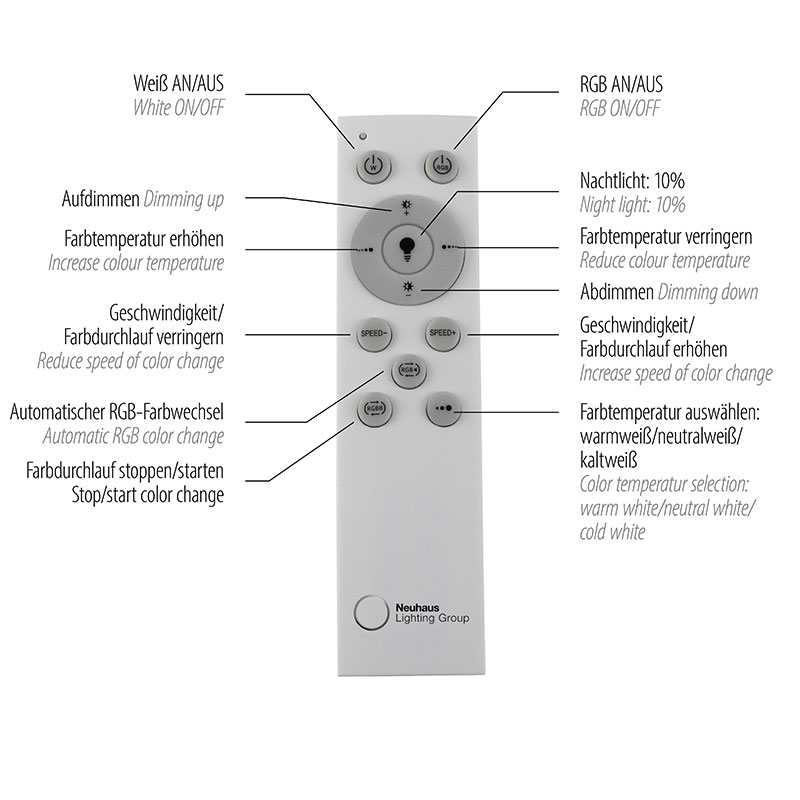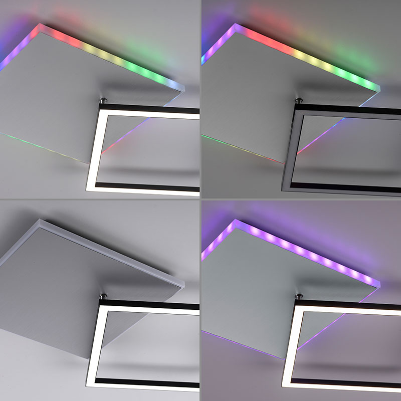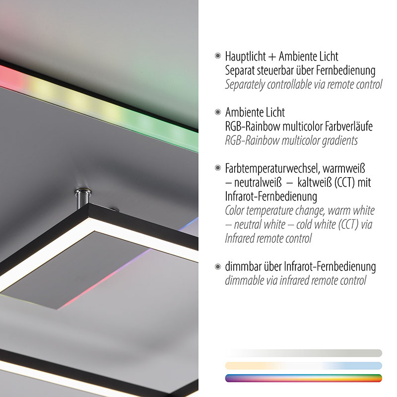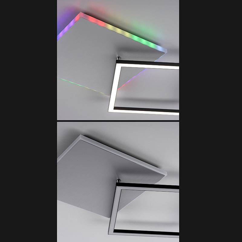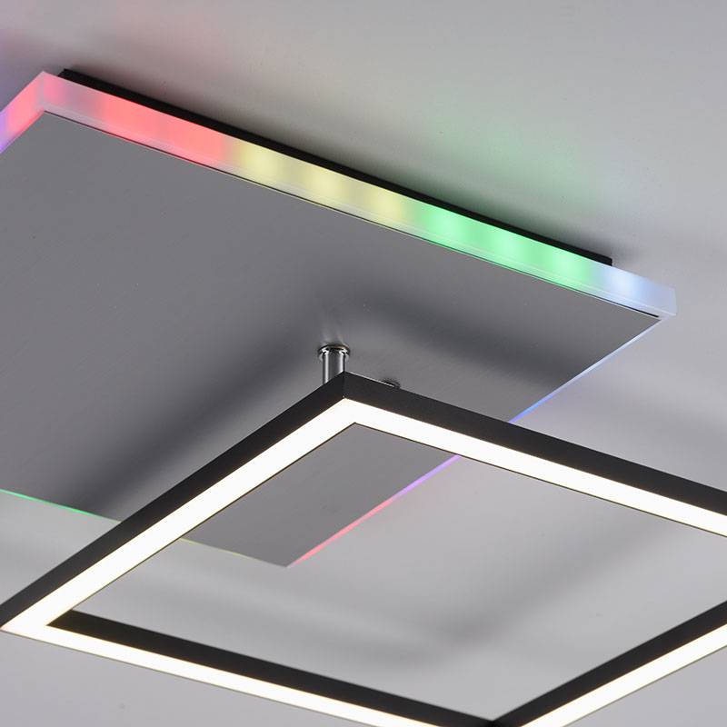 Осветително тяло - LED Плафон с дистанционно Renda, изработен от алуминий в черен цвят и акрил. Плафонът е с дистанционно управление, чрез което лесно и удобно можете да включвате и изключвате осветителното тяло; да димирате - увеличавате или намалявате светлината; да променяте цветната температура - от топла към студена светлина; да променяте цветовете - червен, зелен, син и техните производни; с функция Нощна лампа - 10% светлина. Плафонът също е с модул RGB RAINBOW, което означава, че можете да включите няколко цвята едновременно. Производител Leuchten Direkt, Германия.