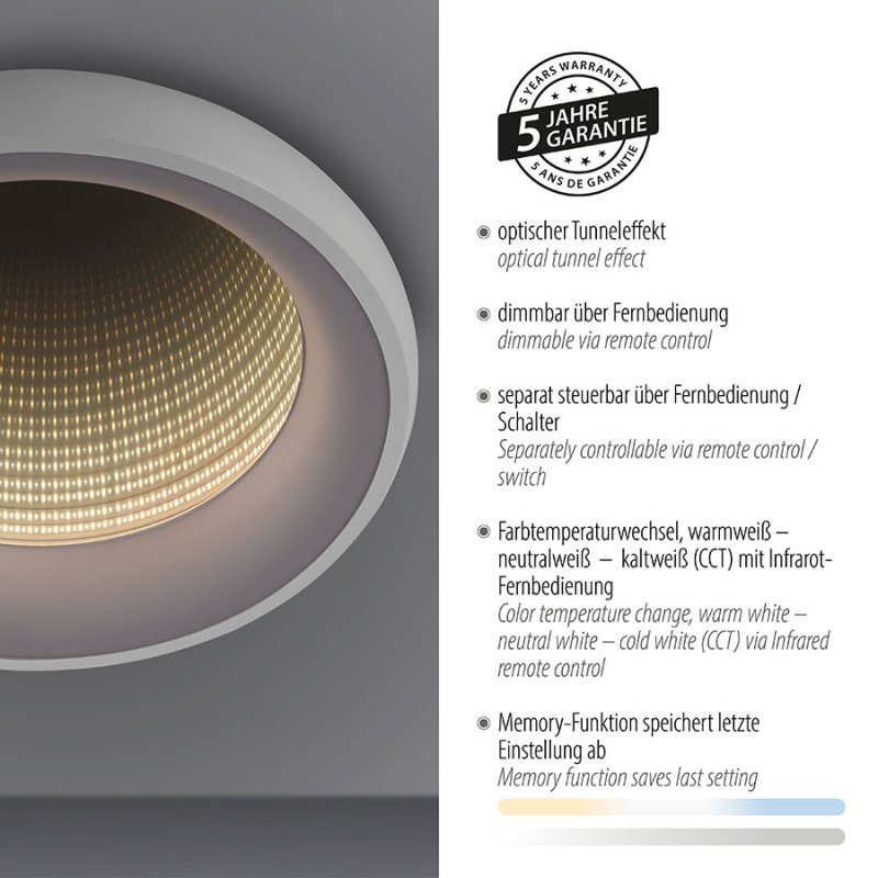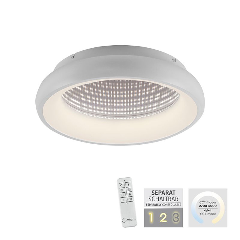 Плафонът е с включено дистанционно управление, чрез което лесно и удобно можете да включвате и изключвате осветителното тяло; да димирате - увеличавате или намалявате силата на светлината; да променяте цветната температура от топла към студена светлина (2700K-5000K). Таванната лампа е с функция памет, която запомня последните ви настройки за максимално удобство. Оптичният тунелен ефект създава невероятна визуална дълбочина, превръщайки плафона в истинско произведение на изкуството.