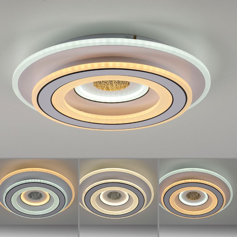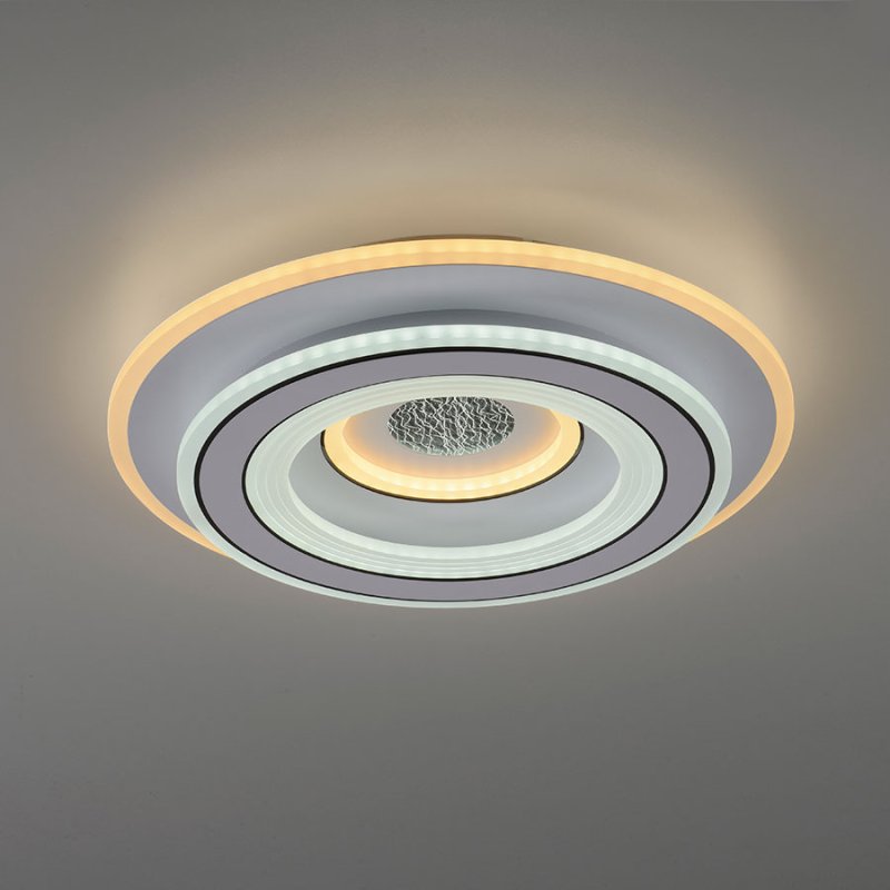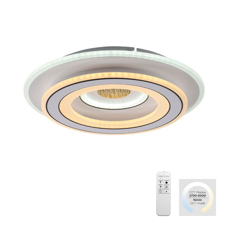 Плафонът е с включено дистанционно управление, чрез което лесно и удобно можете да включвате и изключвате осветителното тяло; да димирате - увеличавате или намалявате силата на светлината; да променяте цветната температура от топла към студена светлина (3000K-6500K); да включвате нощно осветление за деликатна светлина през нощта. Таванната лампа е с функция памет, която запомня последните ви настройки за максимално удобство.