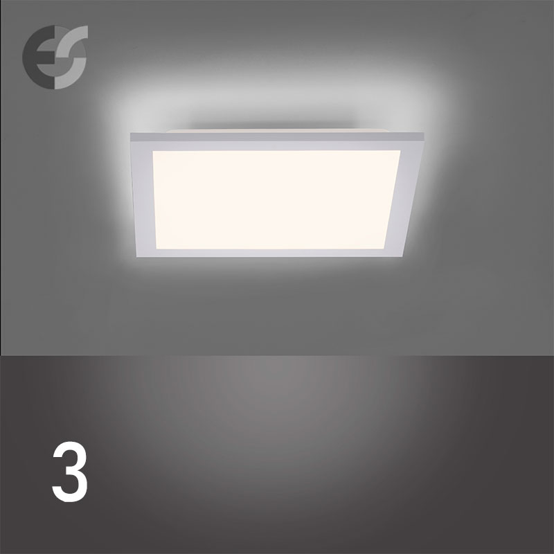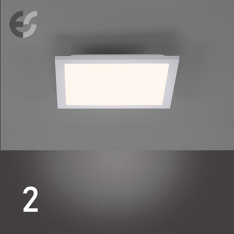 Осветително тяло - LED плафон FLAT, изработен от метал и акрилен разсейвател в бяло. плафонът е с два светлоизточника. Двата светлоизточника могат да бъдат управлявани чрез ключа на стената - с първото вклчване на лампата - свети целия плафон, когато изключите и я включите за втори път свети само външната част, а когато я включите за трети път - светва само вътрешната част. Осветителното тяло е подходящо за осветление за всекидневна, осветление за спалня, осветление за коридор, осветление за офис. Производител Leuchten Direkt, Германия.