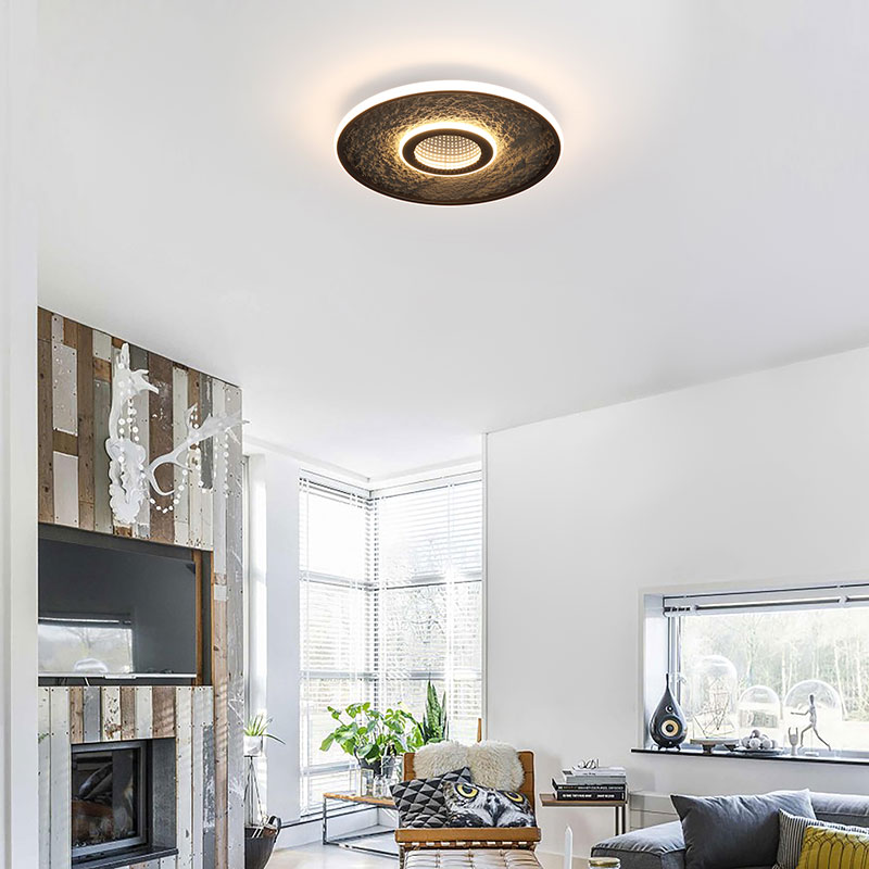 LED плафон Lumadisc впечатлява с модерен и артистичен дизайн, който превръща осветлението в изразен интериорен акцент. Тялото е изработено в матово черно покритие с елегантна дискова форма и текстурирана вътрешна повърхност, която създава дълбочина и визуален интерес. Централно разположеният LED източник оформя мек светлинен ореол, осигуряващ приятна, равномерна и топла светлина. Благодарение на трисетапното димиране чрез стандартен стенен ключ, осветлението лесно се адаптира към различни настроения и ситуации, което прави модела подходящ за дневни, спални, коридори и съвременни интериори с изчистена визия.