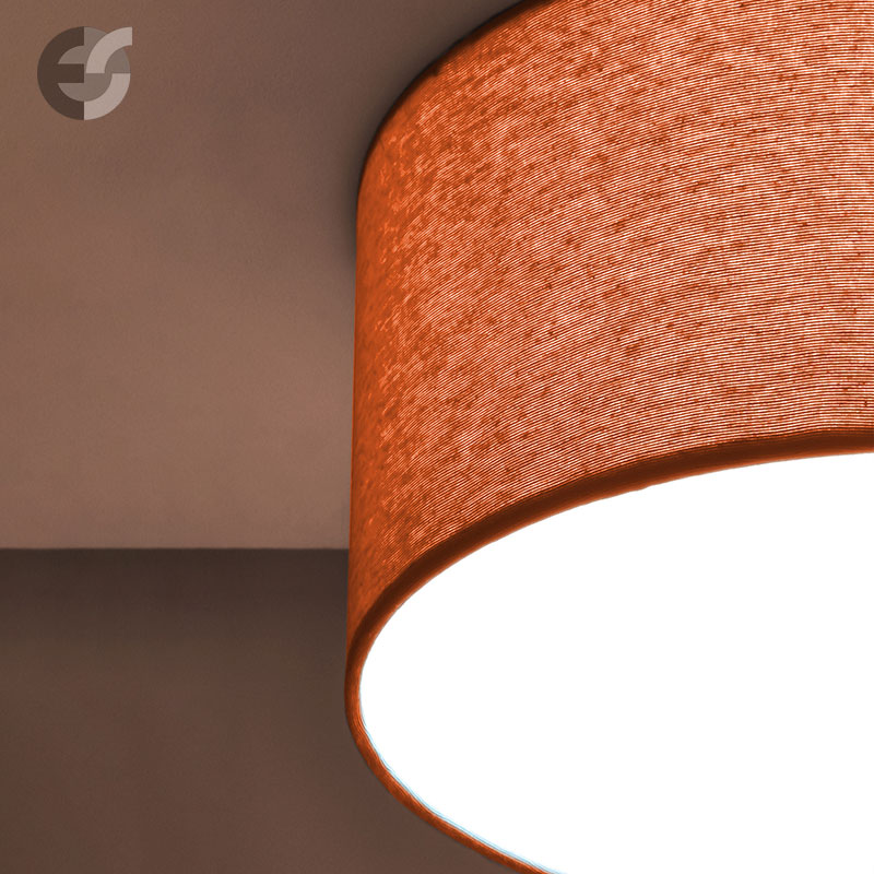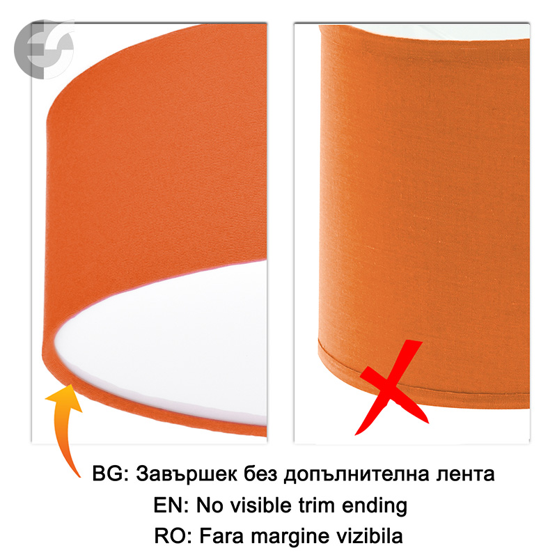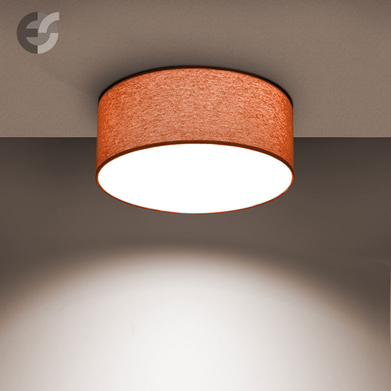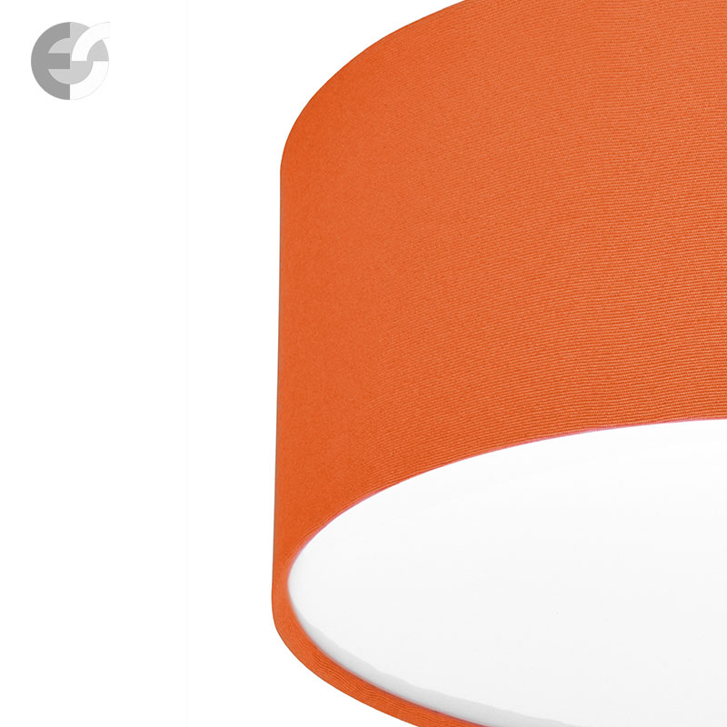 Осветително тяло - стилен и модерен плафон, изработен от метална основа, текстилен абажур оранжев цвят и PVC разсейвател. Дизайнът на плафона е семпъл, което го прави подходящ за всеки интериор. Лампата се инсталира на тавана, като не се изисква сглобавяне, единствено трябва да премахнете защитното фолио на разсейвателя и да го поставите в плафона. Плафонът за всекидневна, осветление за детска стая, осветление за кухня, осветление за коридор, осветление за заведение, осветление за хотел. Производител CoupLight, България.