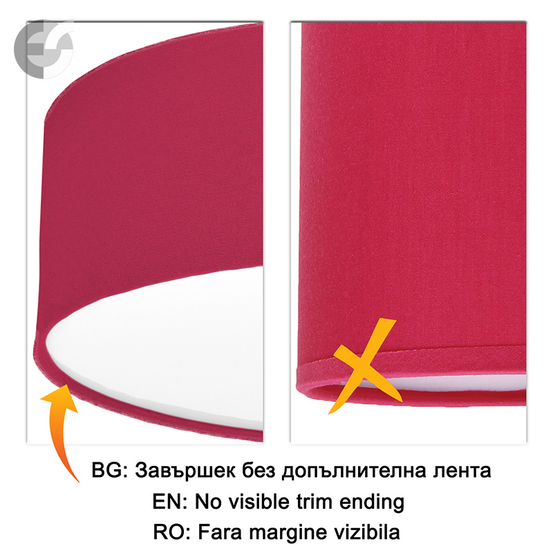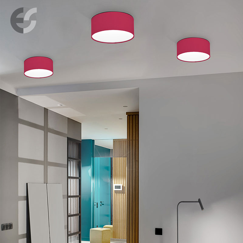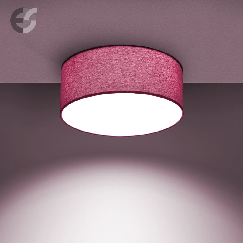 Осветително тяло - стилен и модерен плафон, изработен от метална основа, текстилен абажур в тъмнорозов цвят и PVC разсейвател. Дизайнът на плафона е семпъл, което го прави подходящ за всеки интериор. Лампата се инсталира на тавана, като не се изисква сглобавяне, единствено трябва да премахнете защитното фолио на разсейвателя и да го поставите в плафона. Плафонът за всекидневна, осветление за детска стая, осветление за кухня, осветление за коридор, осветление за заведение, осветление за хотел. Производител CoupLight, България.