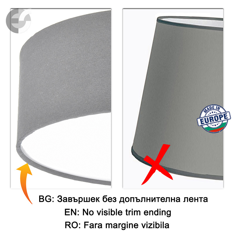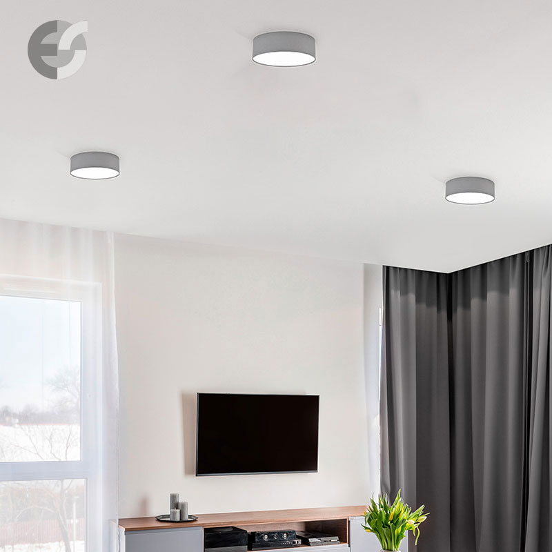 Осветително тяло - стилен и модерен плафон, изработен от метална основа и текстилен абажур в сив цвят и PVC разсейвател. Дизайнът на плафона е семпъл, което го прави подходящ за всеки интериор. Лампата се инсталира на тавана, като не се изисква сглобавяне, единствено трябва да премахнете защитното фолио на разсейвателя и да го поставите в плафона. Плафонът е подходящ за всекидневна, осветление за детска стая, осветление за кухня, осветление за коридор, осветление за заведение, осветление за хотел. Производител CoupLight, България.