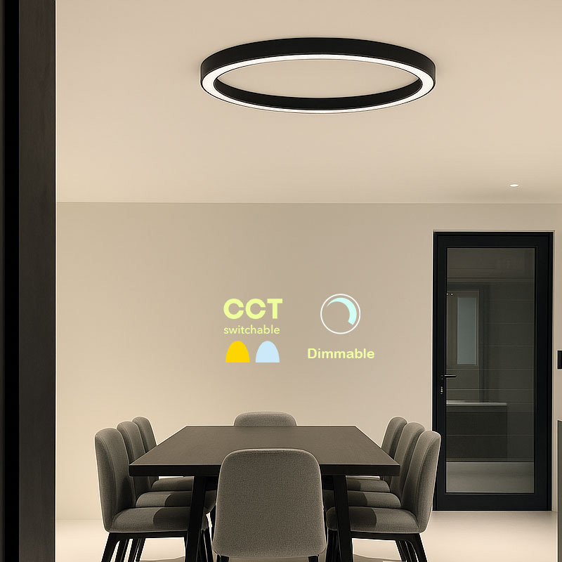 LED плафон Hey-lo, изработен от алуминиева основа в пясъчно черен цвят и разсейвател от акрил в кръгла форма. Hey-lo преобразява помещенията с архитектурния си дизайн и форма тип пръстен. Създава елегантен ореол от светлина, която преминава меко и равномерно без да заслепява.