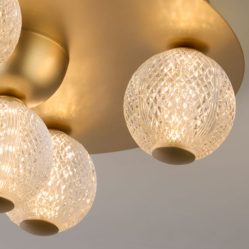 LED плафонът Asteroid е изработен от мека стомана в изтънчен златист цвят, със сферични разсейватели от прозрачен акрил с текстура на малки ромбчета. Плафонът се отличава с луксозен дизайн и кръгла форма, придаваща елегантен и съвременен акцент във всяко помещение.