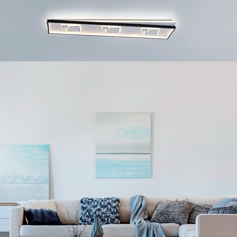 Осветително тяло - LED плафон MAILAK с модерен и уникален дизайн, изработен от метал и акрил. Дизайнът на таванната лампа MAILAK е изключително интересен. Той се състои от два правоъгълника - единият от тях с външна светлина по ръба, а другият с вътрешна. Излизащият от рамката квадрати създават сложен и загадъчен облик, подчертан от черната рамка. Във вътрешността на двата пресечени правоъгълника се намират още два правоъгълника, които допълват артисичката игра на форми и светлина. Плафонът е подходящ за осветление за спалня, осветление за всекидневна, осветление за коридор, осветление за всекидневна. Производител Paul Neuhaus, Германия.