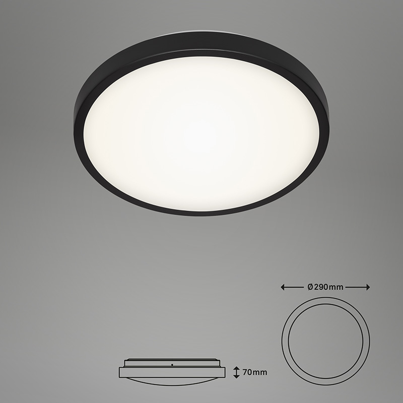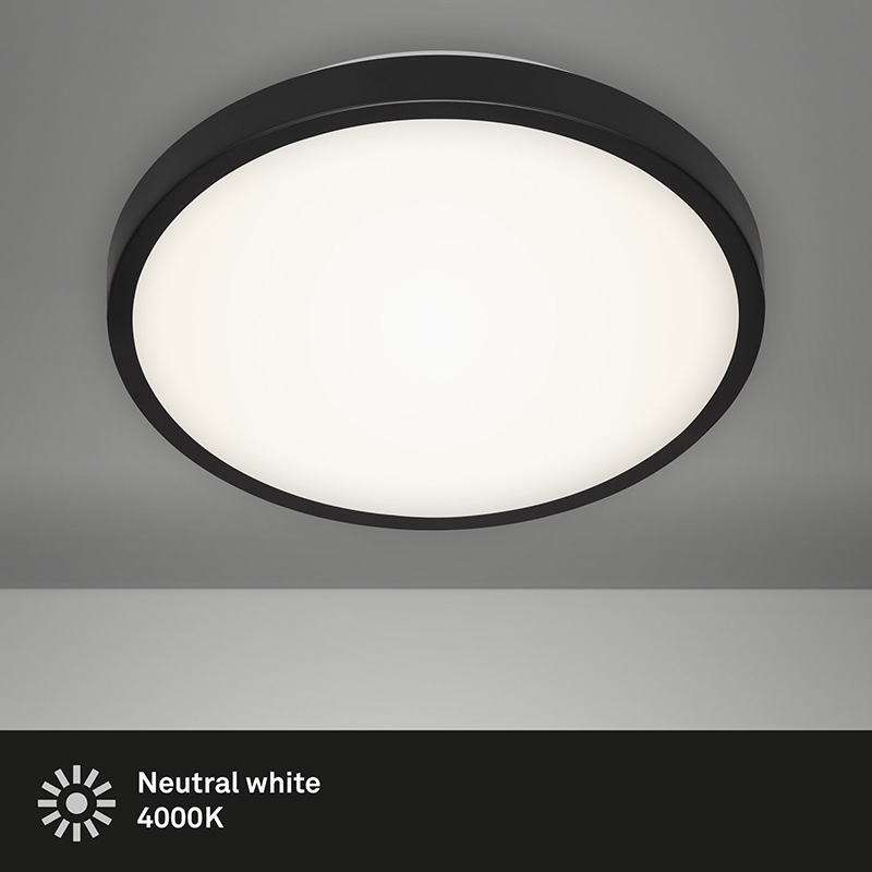 Осветително тяло - лед плафон MANNY с неутрална светлина, изработен от метал в черен цвят и пластмасов разсейвател в бяло. Дизайнът на осветителното тяло е подходящ за осветление за всекидневна, осветление за коридор, осветление за спалня. Производител BRILO, Германия.