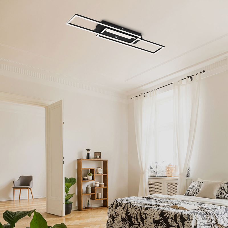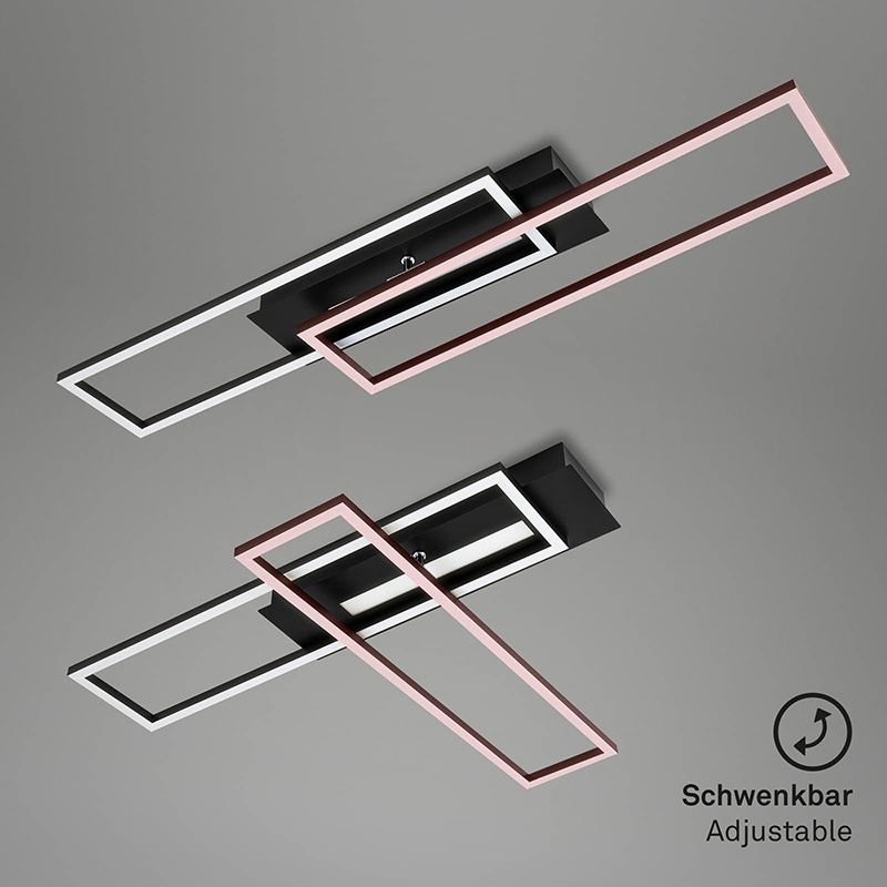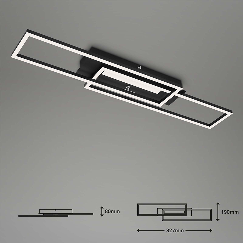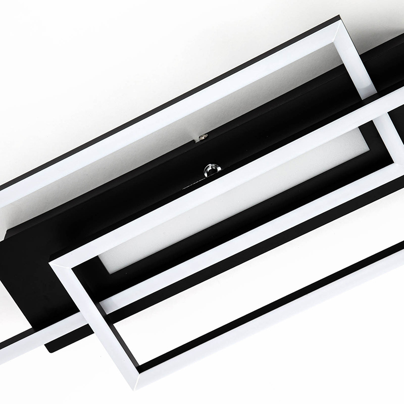 Осветително тяло - лед плафон FRAME MID, изработен от метална основа в черен цвят и пластмасов разсейвател. Плафонът е с 3 светлоизточника, които могат да бъдат включвани отделно. Разсейвателите на плафона са подвижни. Плафонът е с функция памет, чрез която помни вашите последни настройки. Дизайнът на осветителното тяло е подходящ за осветление за всекидневна, осветление за коридор, осветление за спалня. Производител BRILO, Германия.