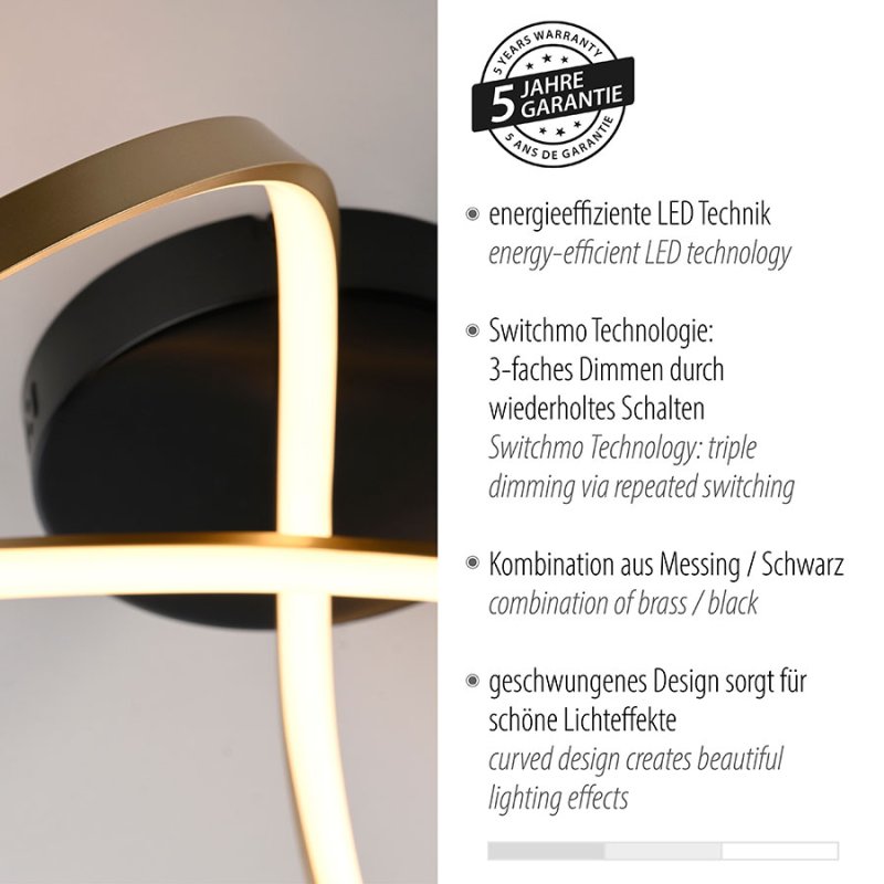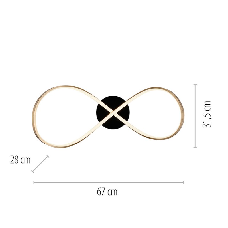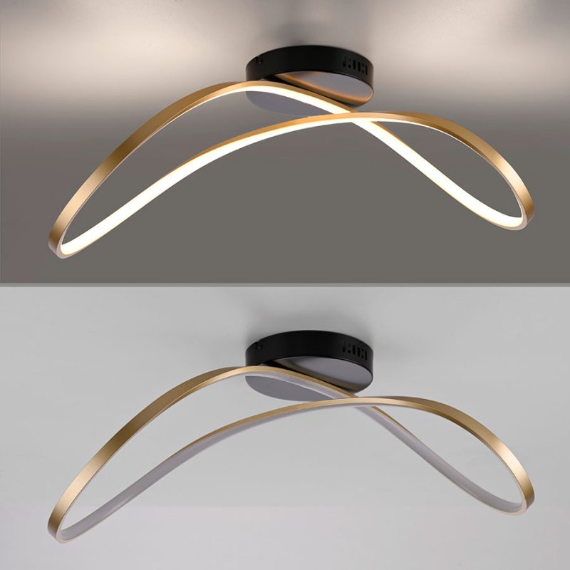 LED плафон OKTA, изработен от алуминий в комбинация от черен и месинг цвят с извита асиметрична форма.
