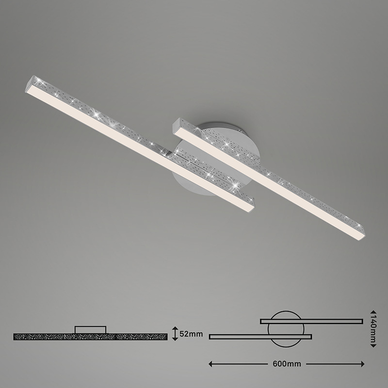 Осветително тяло - LED плафон REY, изработен от метална рамка в цвят хром и пластмасови разсейватели в бяло с ефект звездно небе. Дизайнът на осветителното тяло е подходящ за осветление за всекидневна, осветление за коридор, осветление за спалня. Производител BRILO, Германия.
