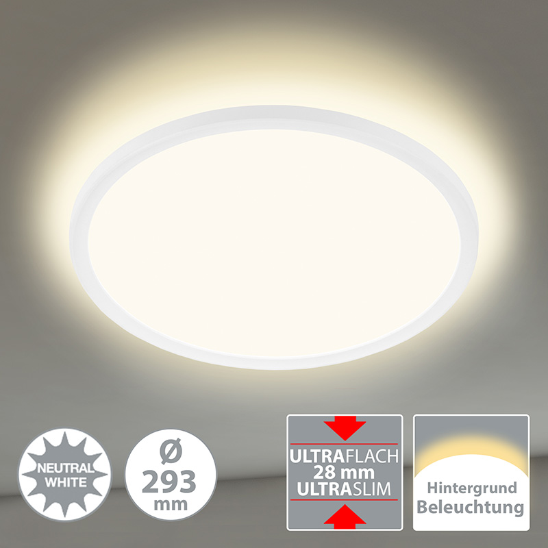 LED плафон SLIM, изработен от метална основа и пластмасов разсейвател в бял цвят, с подсветка. Дизайнът на осветителното тяло е подходящ за осветление за всекидневна, осветление за коридор, осветление за спалня. Производител BRILO, Германия.