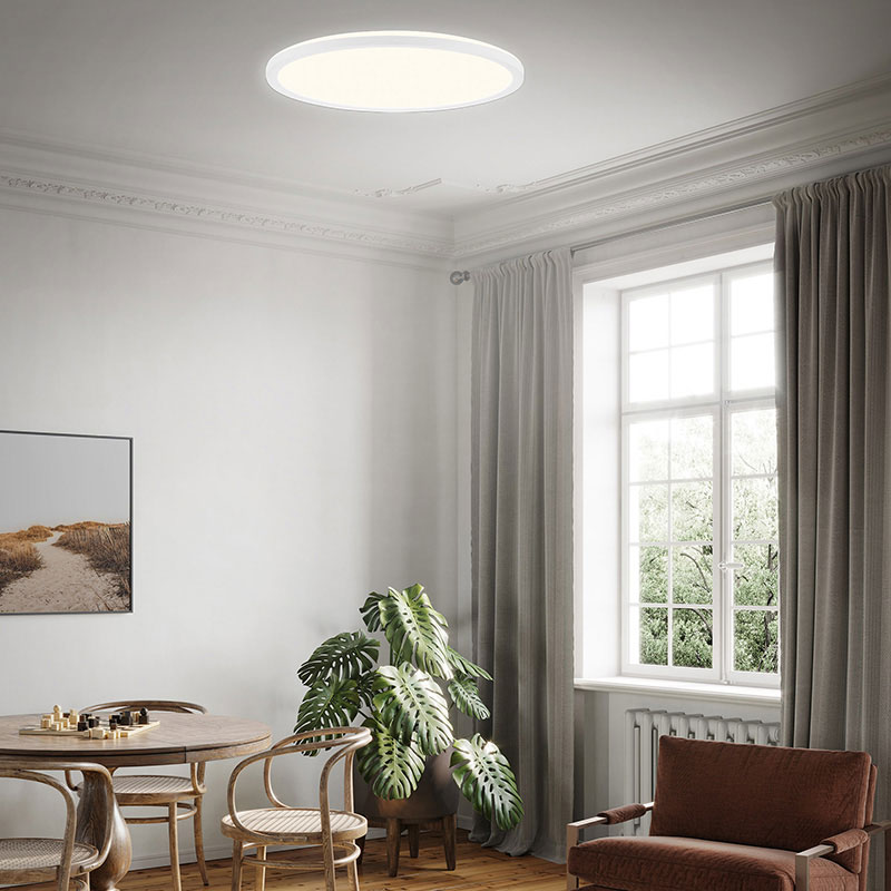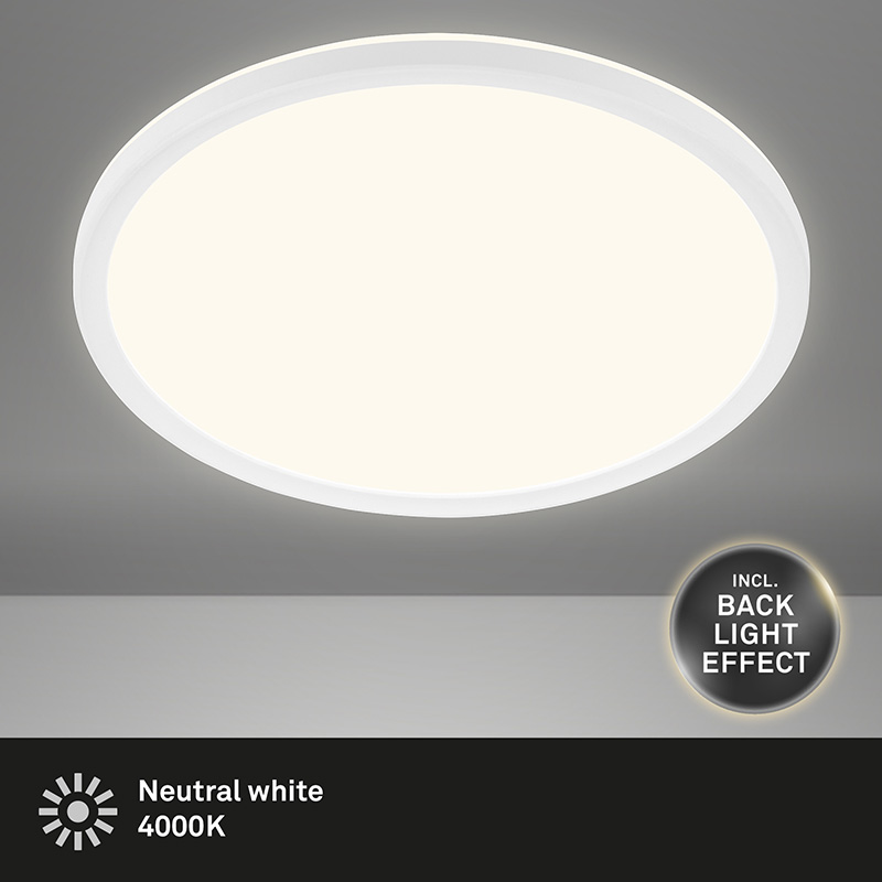 LED плафон SLIM, изработен от метална основа и пластмасов разсейвател в бял цвят, с подсветка. Дизайнът на осветителното тяло е подходящ за осветление за всекидневна, осветление за коридор, осветление за спалня. Производител BRILO, Германия.
