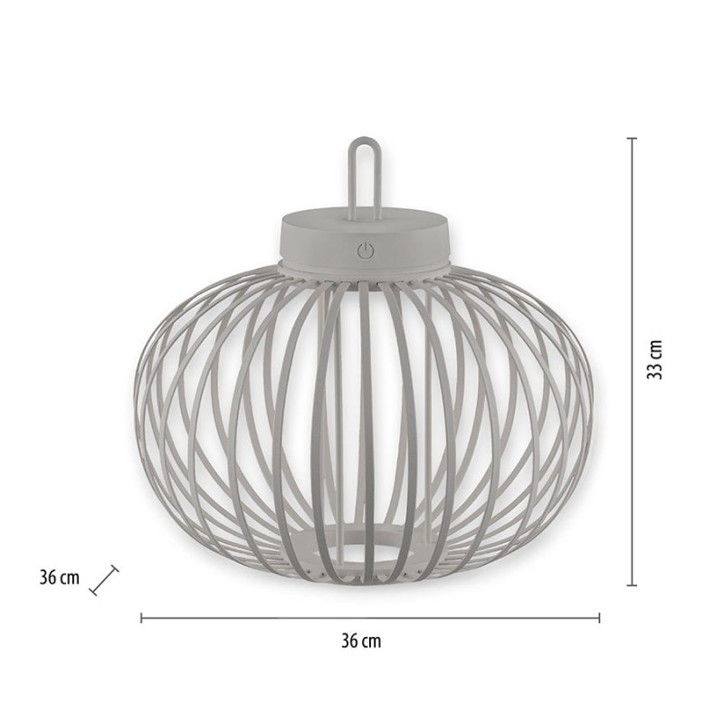 Осветителното тяло е с вградена акумулаторна батерия от 3000 mAh, която се зарежда за 4 часа чрез USB кабел и осигурява до 7 часа непрекъснато осветление. Лампата е с тъч димер за лесно димиране на светлината и функция памет, която запомня последните ви настройки. Осветителното тяло излъчва топла бяла светлина (2700K) и е с IP44 защита (4 - защитен от твърди предмети до 1 мм и 4 - защитен от пръскане от всички посоки), което го прави подходящо за външна употреба.