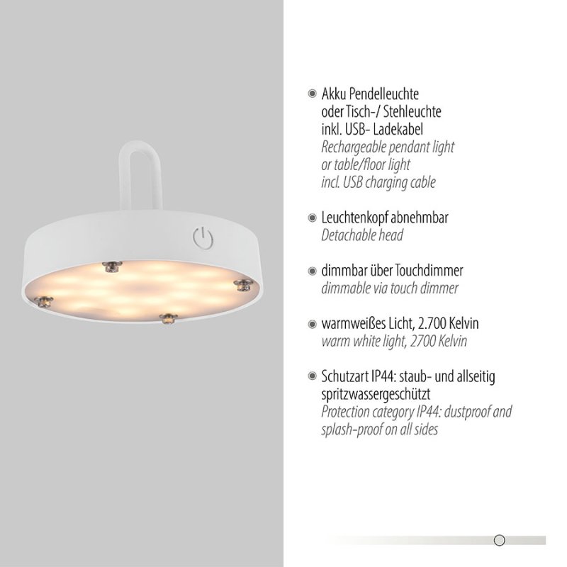 Осветителното тяло е с вградена акумулаторна батерия от 3000 mAh, която се зарежда за 4 часа чрез USB кабел и осигурява до 7 часа непрекъснато осветление. Лампата е с тъч димер за лесно димиране на светлината и функция памет, която запомня последните ви настройки. Осветителното тяло излъчва топла бяла светлина (2700K) и е с IP44 защита (4 - защитен от твърди предмети до 1 мм и 4 - защитен от пръскане от всички посоки), което го прави подходящо за външна употреба.