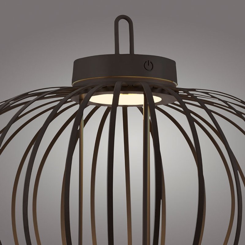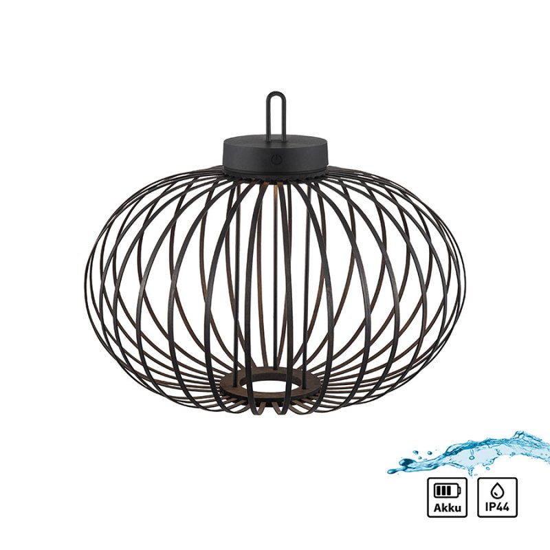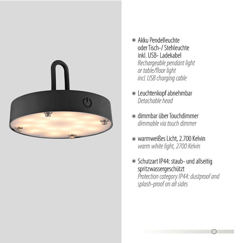 Осветителното тяло е с вградена акумулаторна батерия от 3000 mAh, която се зарежда за 4 часа чрез USB кабел и осигурява до 7 часа непрекъснато осветление. Лампата е с тъч димер за лесно димиране на светлината и функция памет, която запомня последните ви настройки. Осветителното тяло излъчва топла бяла светлина (2700K) и е с IP44 защита (4 - защитен от твърди предмети до 1 мм и 4 - защитен от пръскане от всички посоки), което го прави подходящо за външна употреба.