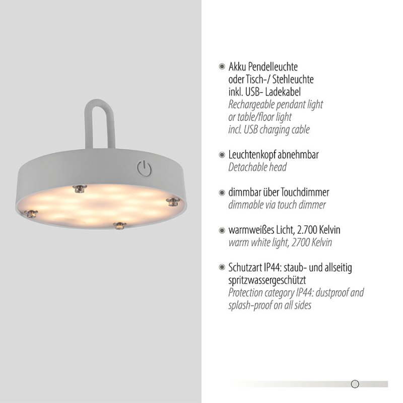 Осветителното тяло е с вградена акумулаторна батерия от 3000 mAh, която се зарежда за 4 часа чрез USB кабел и осигурява до 7 часа непрекъснато осветление. Лампата е с тъч димер за лесно димиране на светлината и функция памет, която запомня последните ви настройки. Осветителното тяло излъчва топла бяла светлина (2700K) и е с IP44 защита (4 - защитен от твърди предмети до 1 мм и 4 - защитен от пръскане от всички посоки), което го прави подходящо за външна употреба.