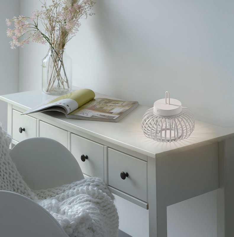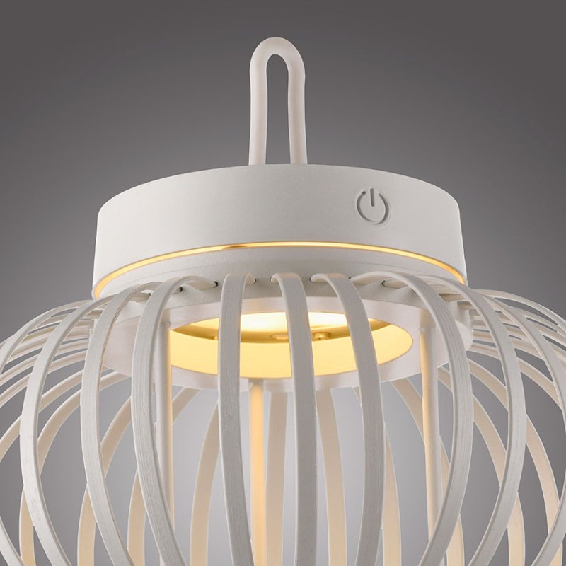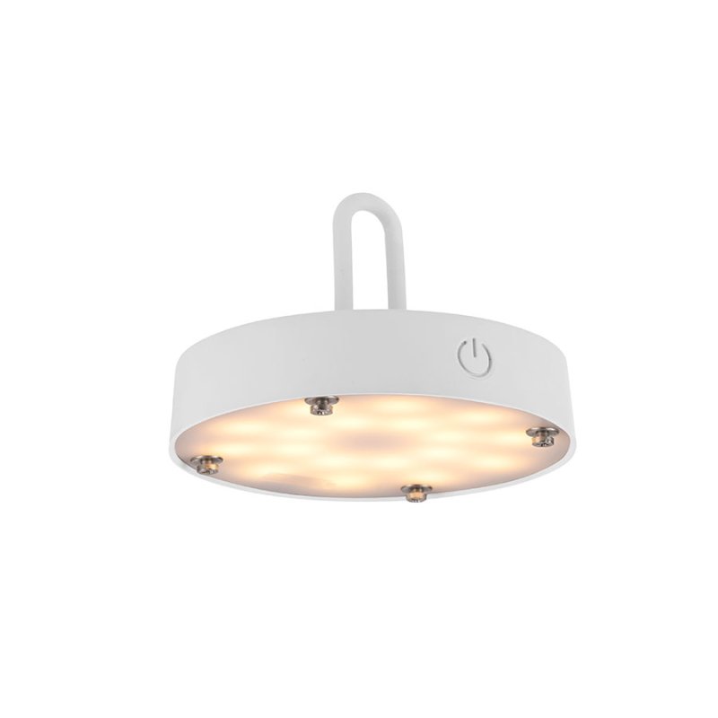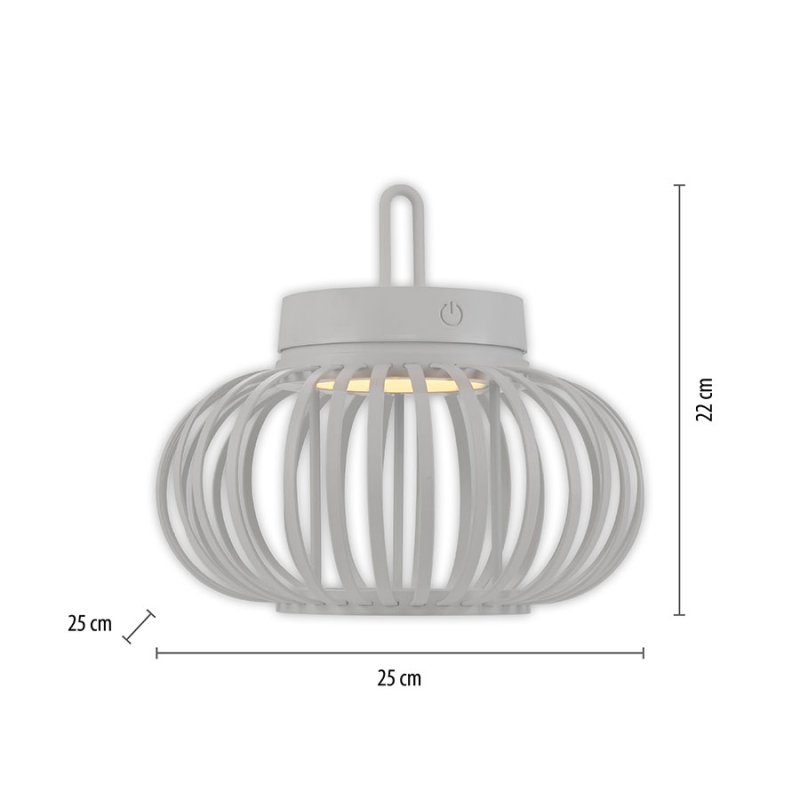 Осветителното тяло е с вградена акумулаторна батерия от 3000 mAh, която се зарежда за 4 часа чрез USB кабел и осигурява до 7 часа непрекъснато осветление. Лампата е с тъч димер за лесно димиране на светлината и функция памет, която запомня последните ви настройки. Осветителното тяло излъчва топла бяла светлина (2700K) и е с IP44 защита (4 - защитен от твърди предмети до 1 мм и 4 - защитен от пръскане от всички посоки), което го прави подходящо за външна употреба.