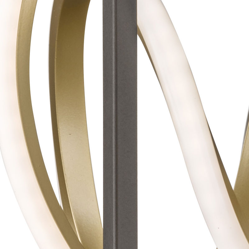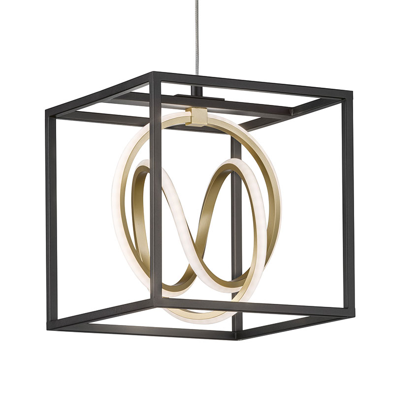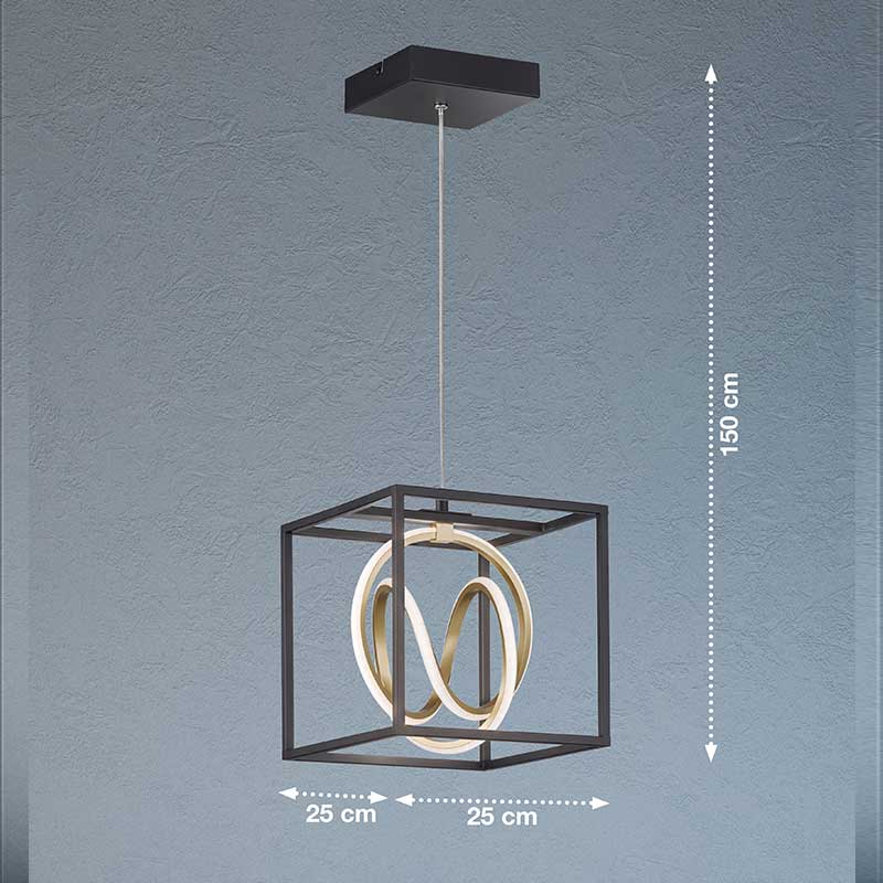 LED полилей Gisi, изработен от черен метал с матово покритие и силиконов разсейвател. Висящата лампа е с форма на куб, с LED светлоизточник, разположен в преплетени златисти пръстени. Полилеят е с дистанционно управление, чрез което лесно можете да включвате и изключвате осветителното тяло, да димирате светлината - плавно намаляване и увеличаване на силата на светене - както и да регулирате цветната температура. С вградената CCT функция плавно преминавате от топла (2700K) към студено - синя светлина (до 6500K), според желаната атмосфера.