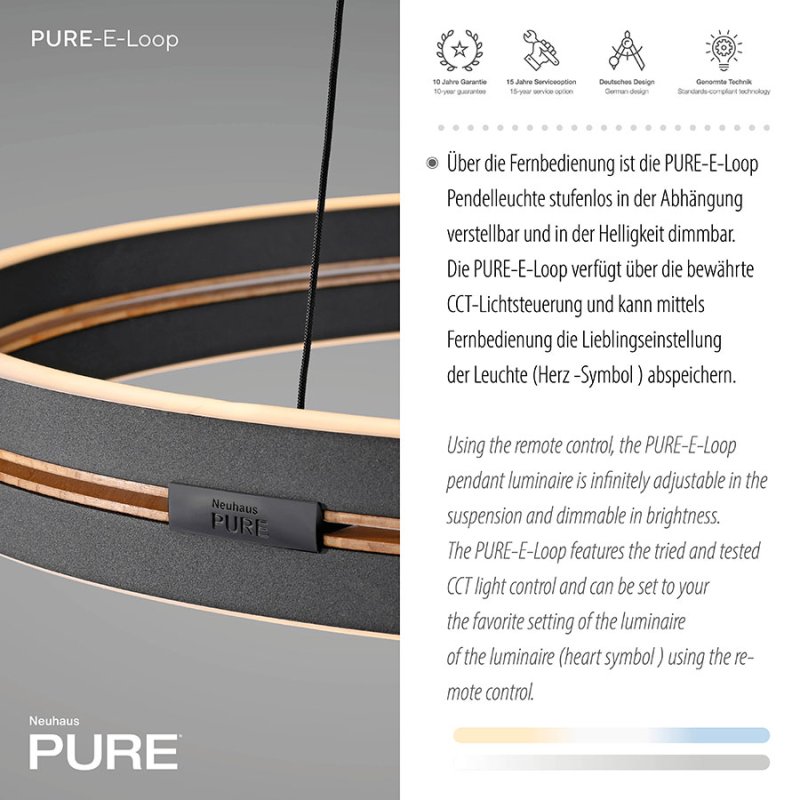 Особен акцент в PURE E-Loop е уникалната e-LIFT® технология, която позволява електрическо регулиране на височината. Дискретно интегриран мотор в основата на полилея улеснява настройката, като осигурява максимално удобство и адаптация към различни тавани. Моля, имайте предвид, че монтажът е възможен само на хоризонтални тавани. Полилеят е с доказано качество и надеждност, потвърдени от впечатляващата 10-годишна гаранция от производителя.
