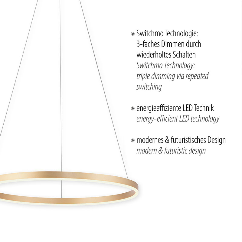 Кръгъл LED полилей RITUS, изработен от алуминий в цвят антрацит и разсейвател в бял цвят. Висящата лампа е с технологията Switchmo за тристепенно димиране (100% - 50% - 12%), позволяваща регулиране на интензитета на светлината чрез ключа на стената.