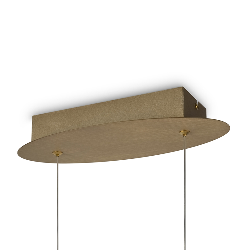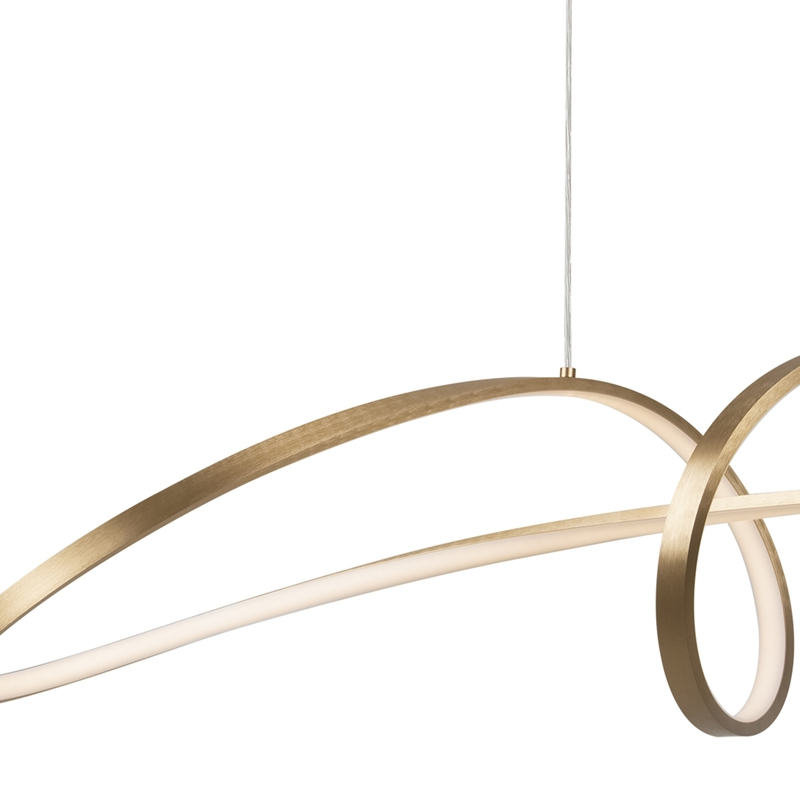 LED полилей Curve е изработен от алуминий в златист цвят с акрилен разсейвател в бяло, разположен по цялата дължина на конструкцията. Отличава се с асиметричната си форма и плавни извивки, които създават усещане за движение и лекота. Кабелите са почти незабележими, което подсилва ефекта на „плаваща светлина“.