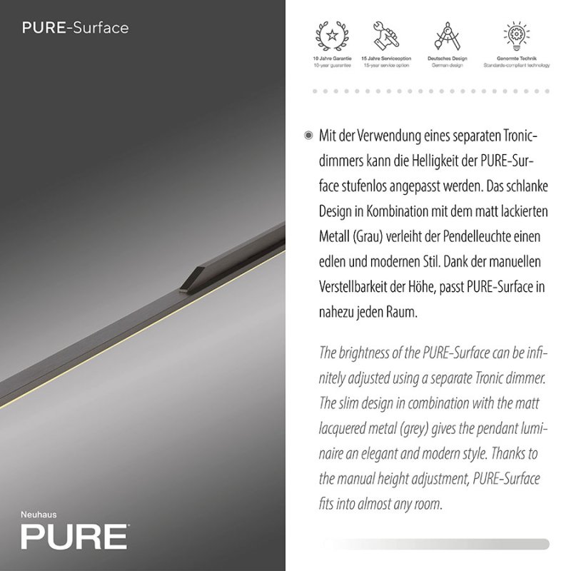 PURE Surface е идеален за осветление на всекидневна, трапезария, барплот или офис. Със своя тънък и минималистичен дизайн, този LED полилей е не само функционален, но и естетически привлекателен, като добавя стил и комфорт във всяко помещение.